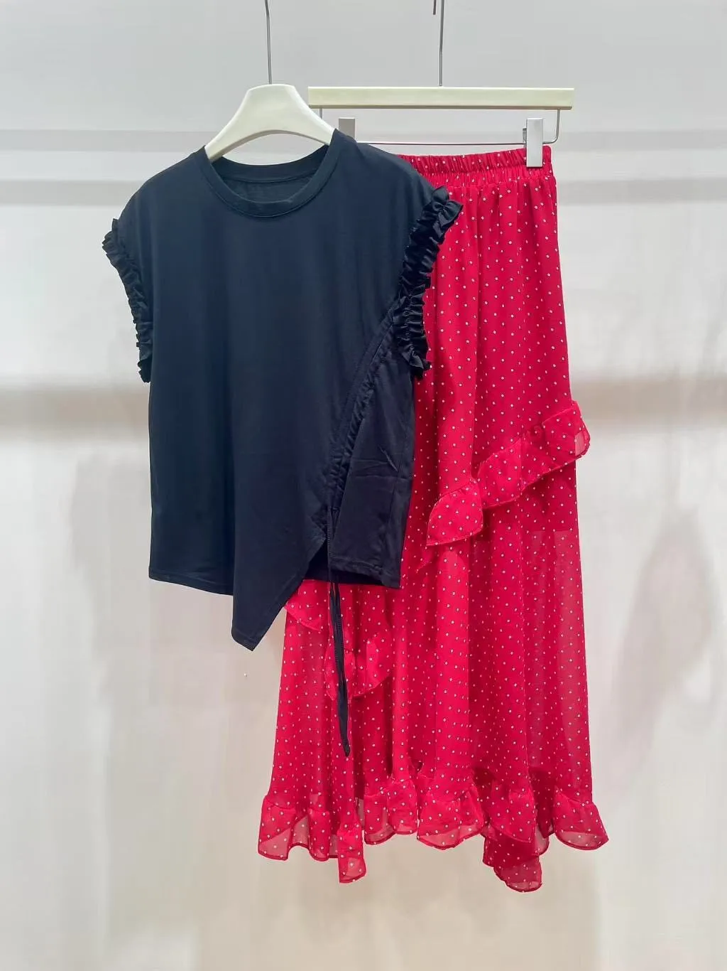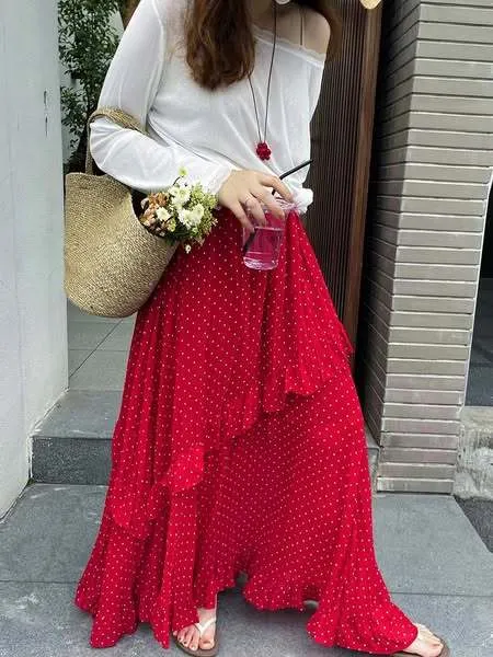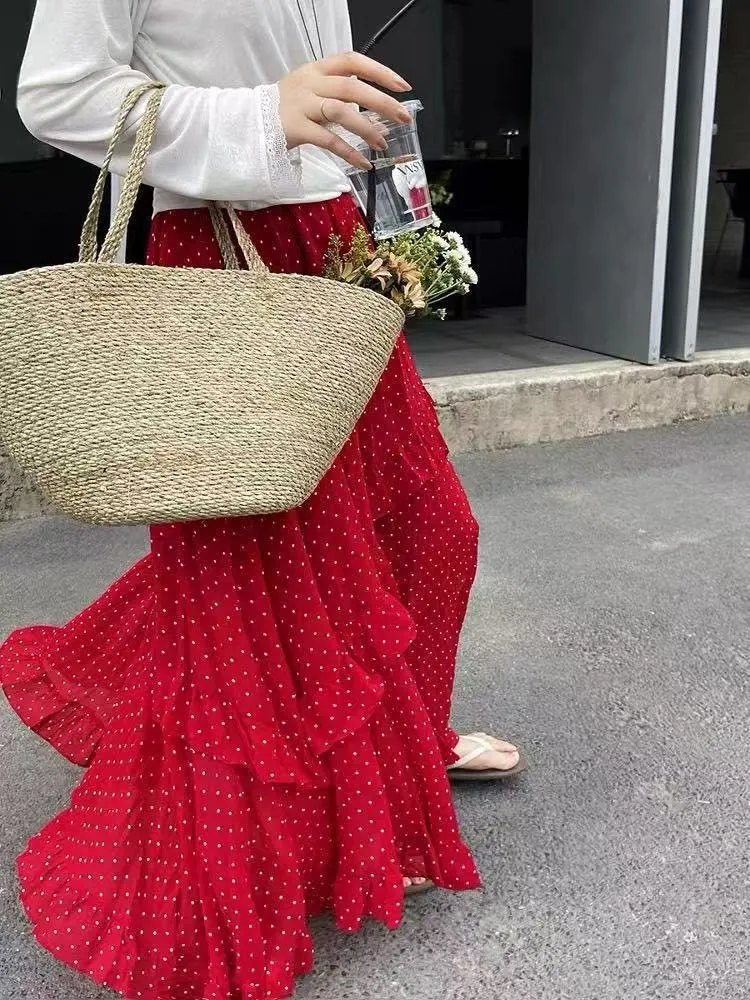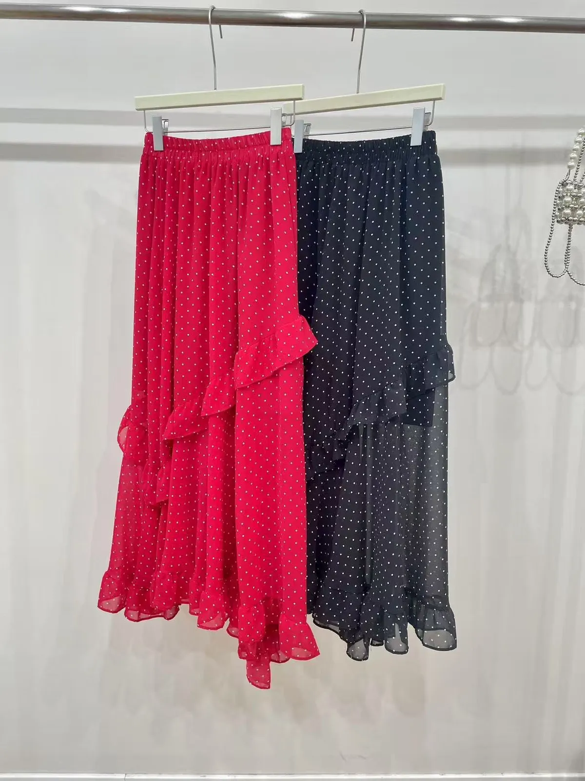 夏日清爽首選! 鬆緊腰頭+輕盈雪紡 輕鬆遮腿又涼感十足 波點+荷葉邊+開衩設計 結合復古與活力 紅色:熱情吸睛 黑色:低調百搭 怎麼搭都時髦 一穿立刻有好心情~ #彈性腰頭 #有內裏 #沒口袋 材質:雪紡