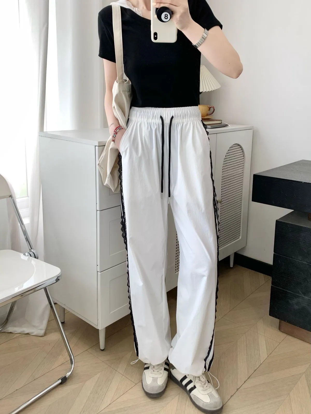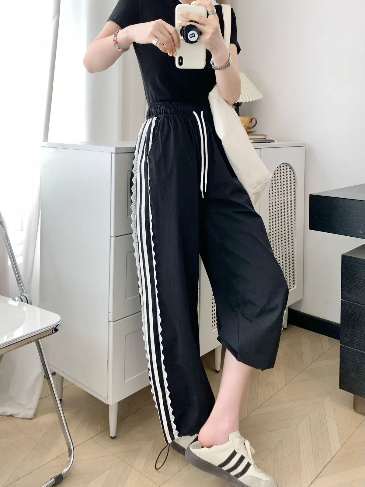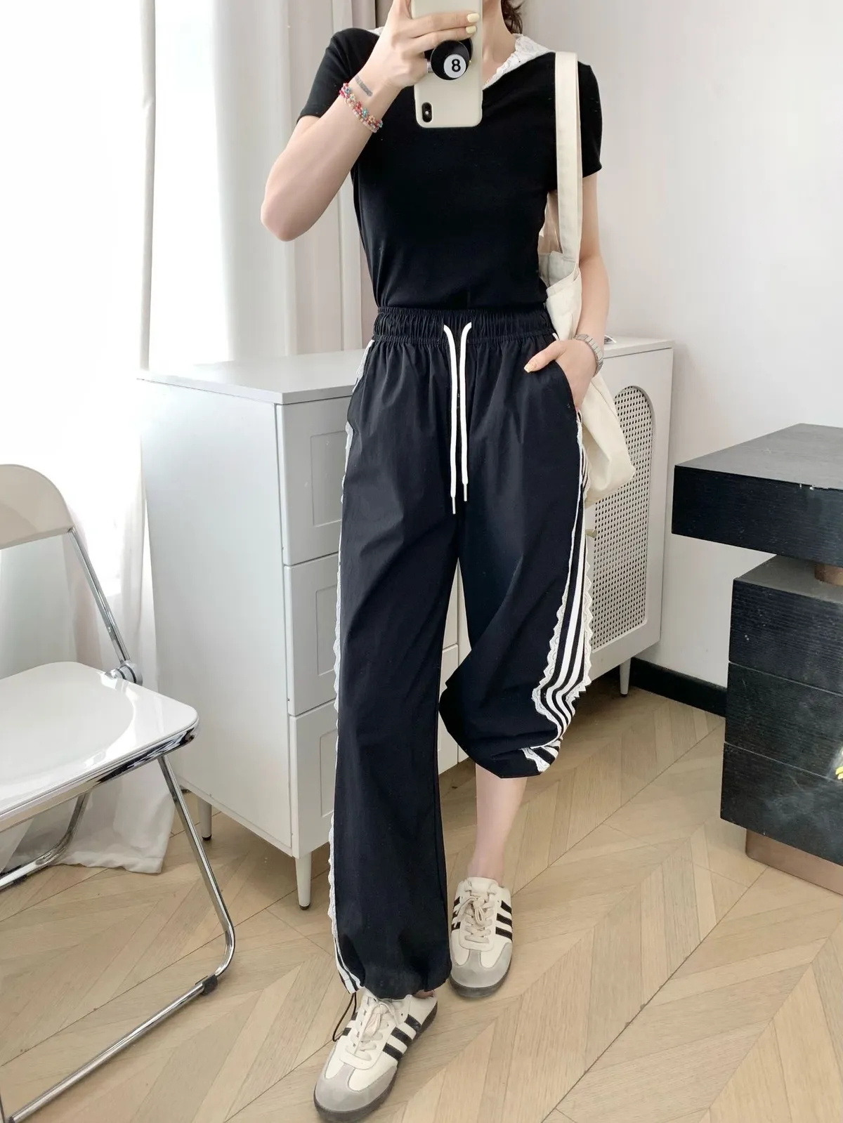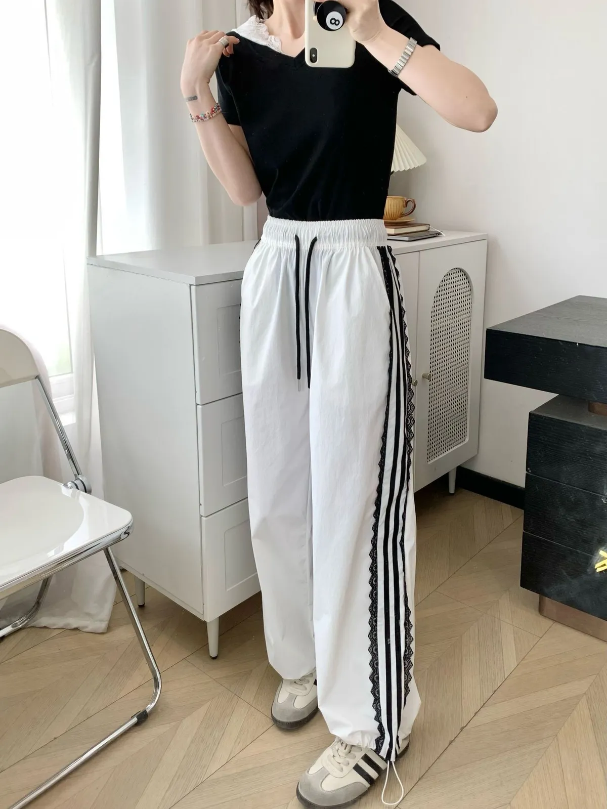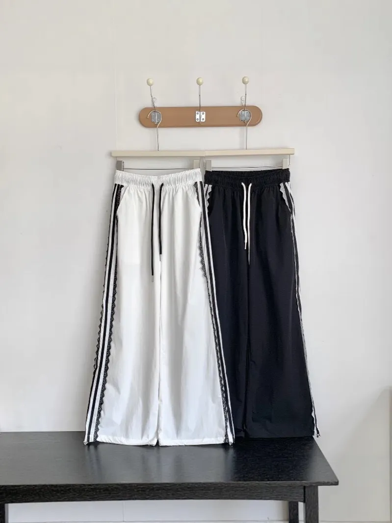 運動酷+甜美感一次GET! 側邊運動條紋➕低調蕾絲拼接細節滿滿又不失個性 輕薄布料,夏日初秋涼爽不悶熱 高腰直筒版型,拉長比例顯腿細 褲腳抽繩設計,且有口袋喔! 不管配背心、短T還是運動外套,走路都自帶風~