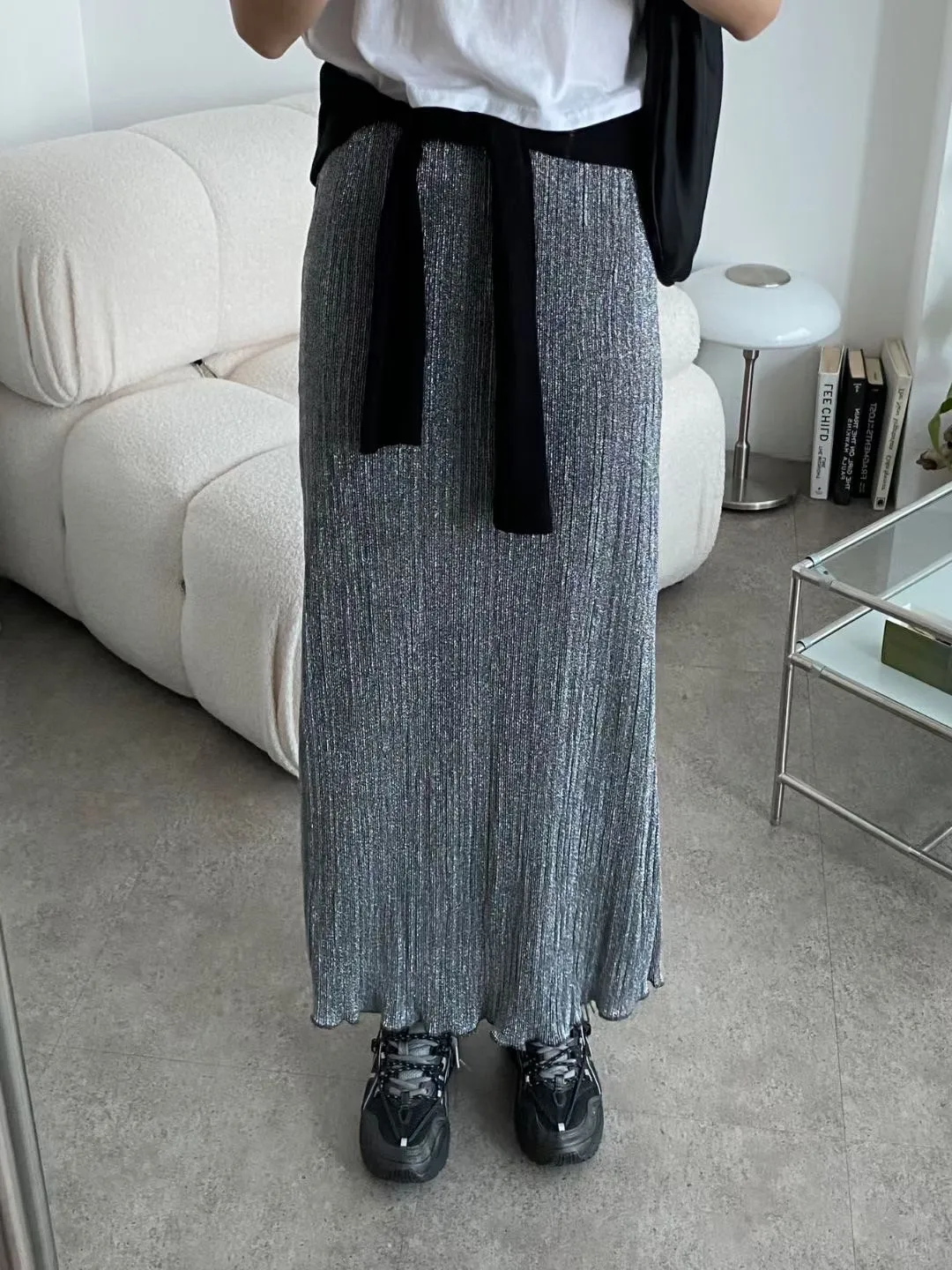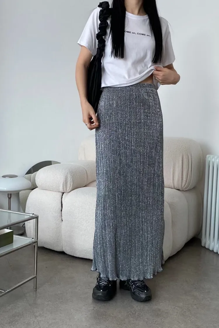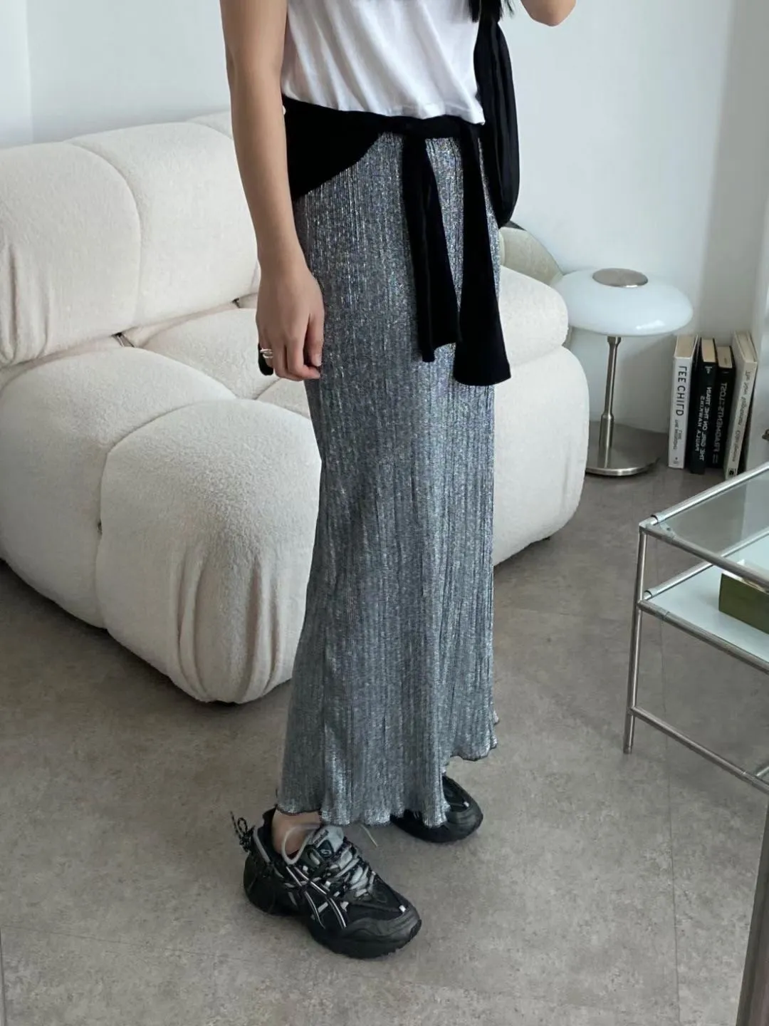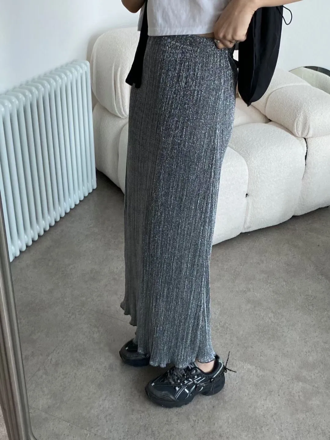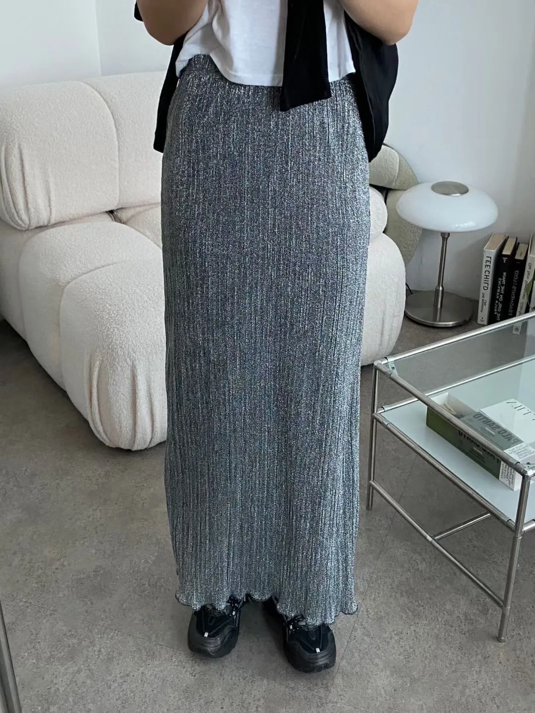 韓國製🇰🇷時髦銀灰色細百摺下擺捲邊長裙