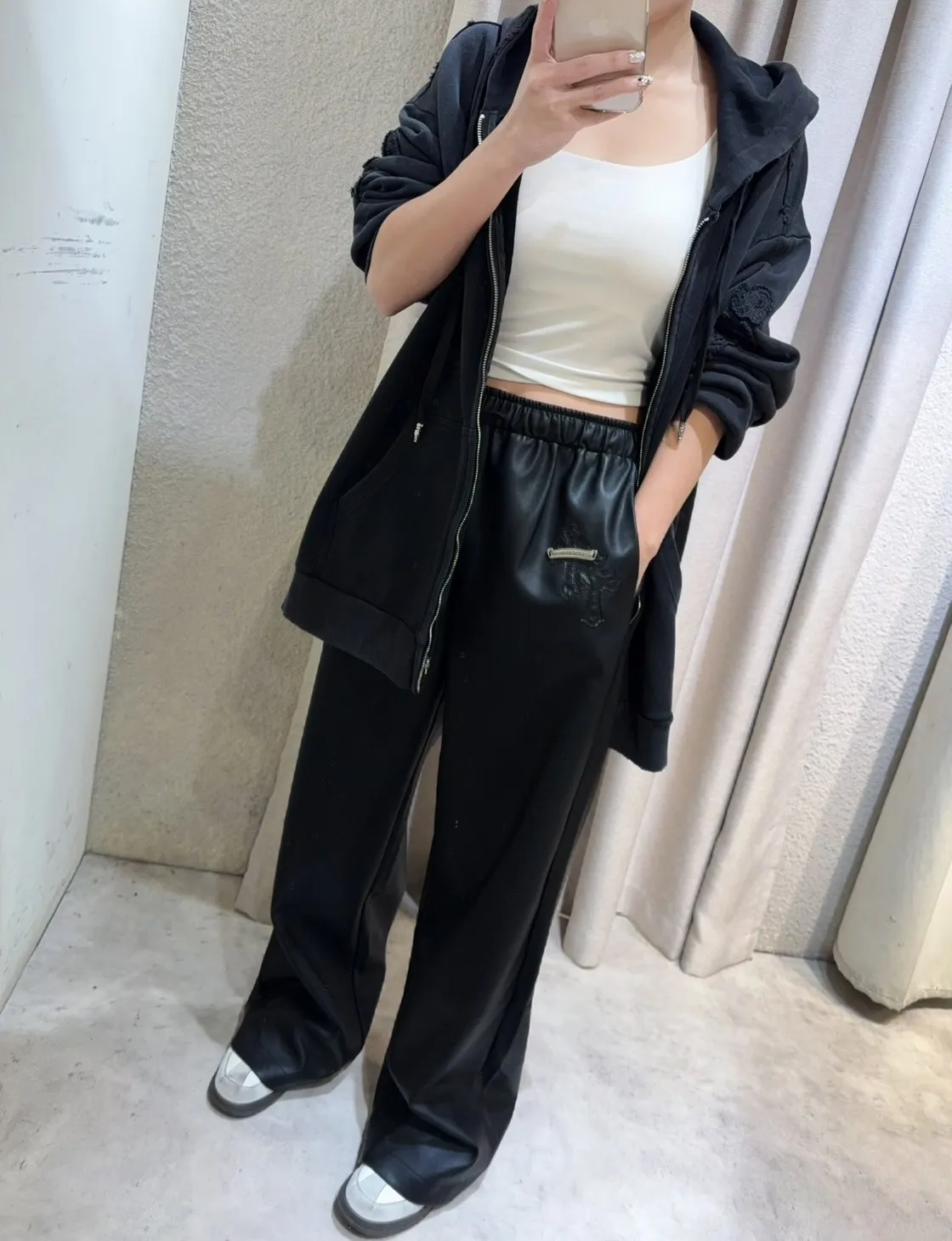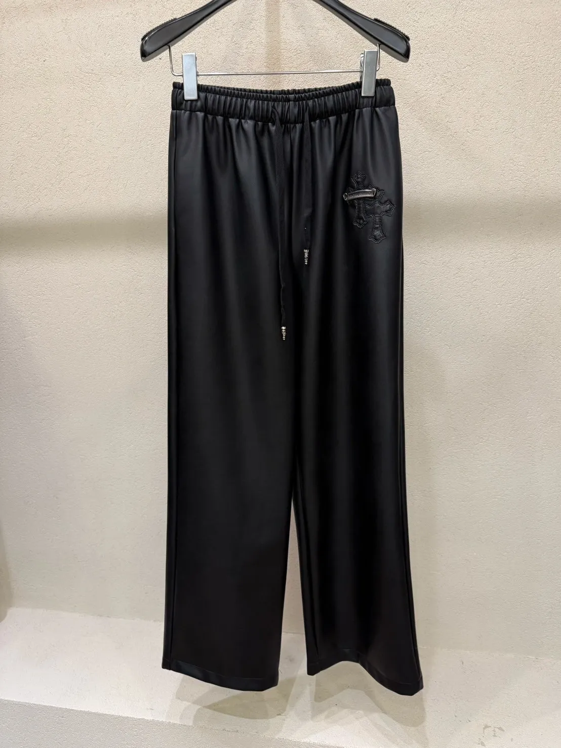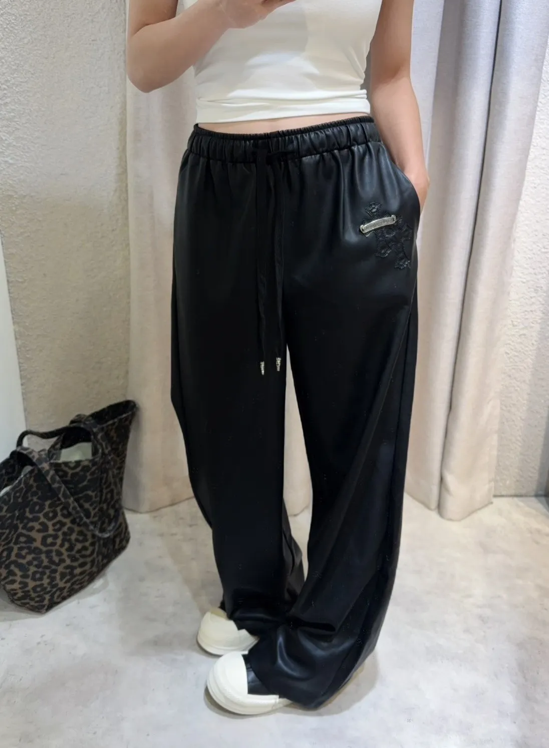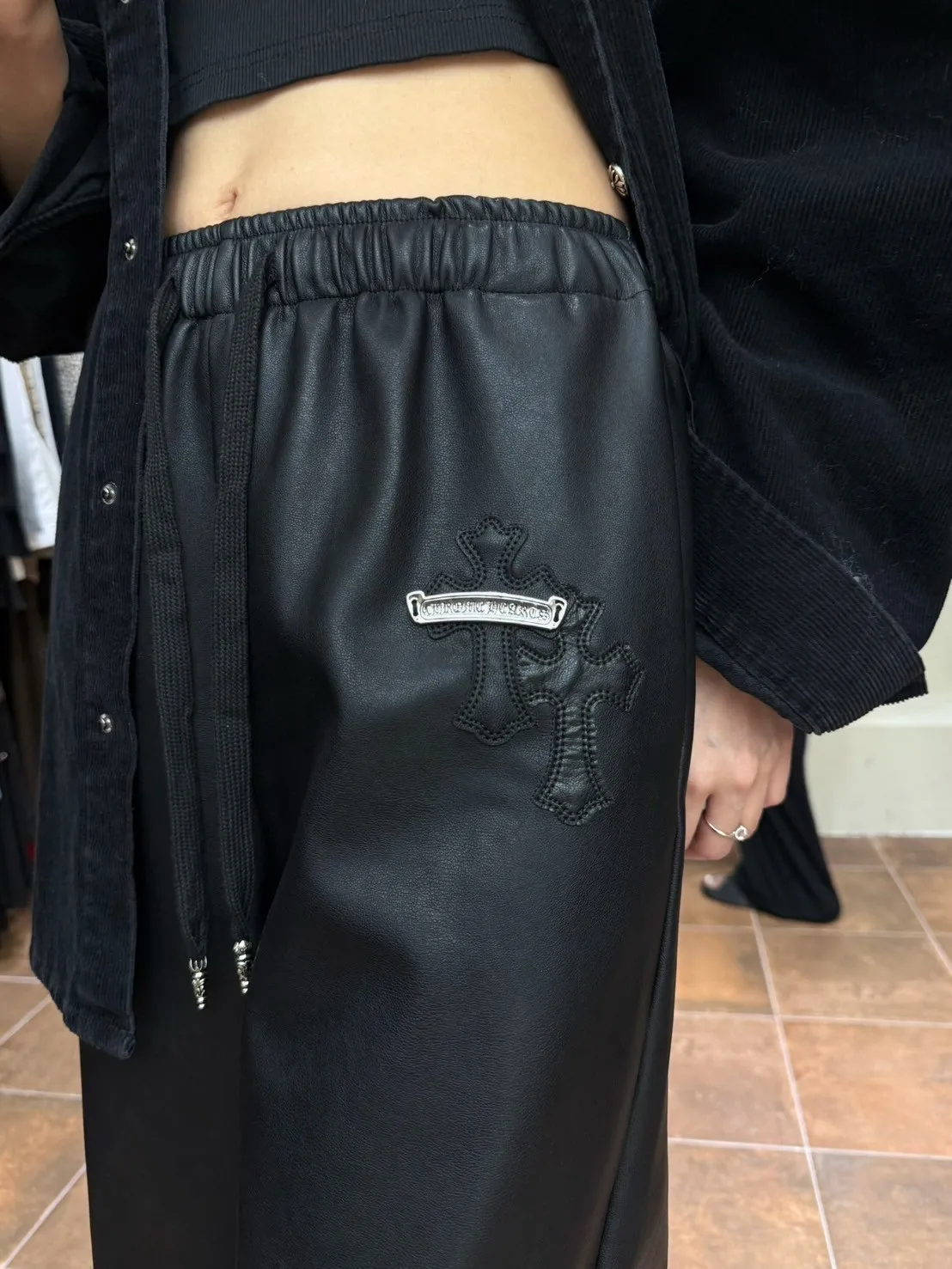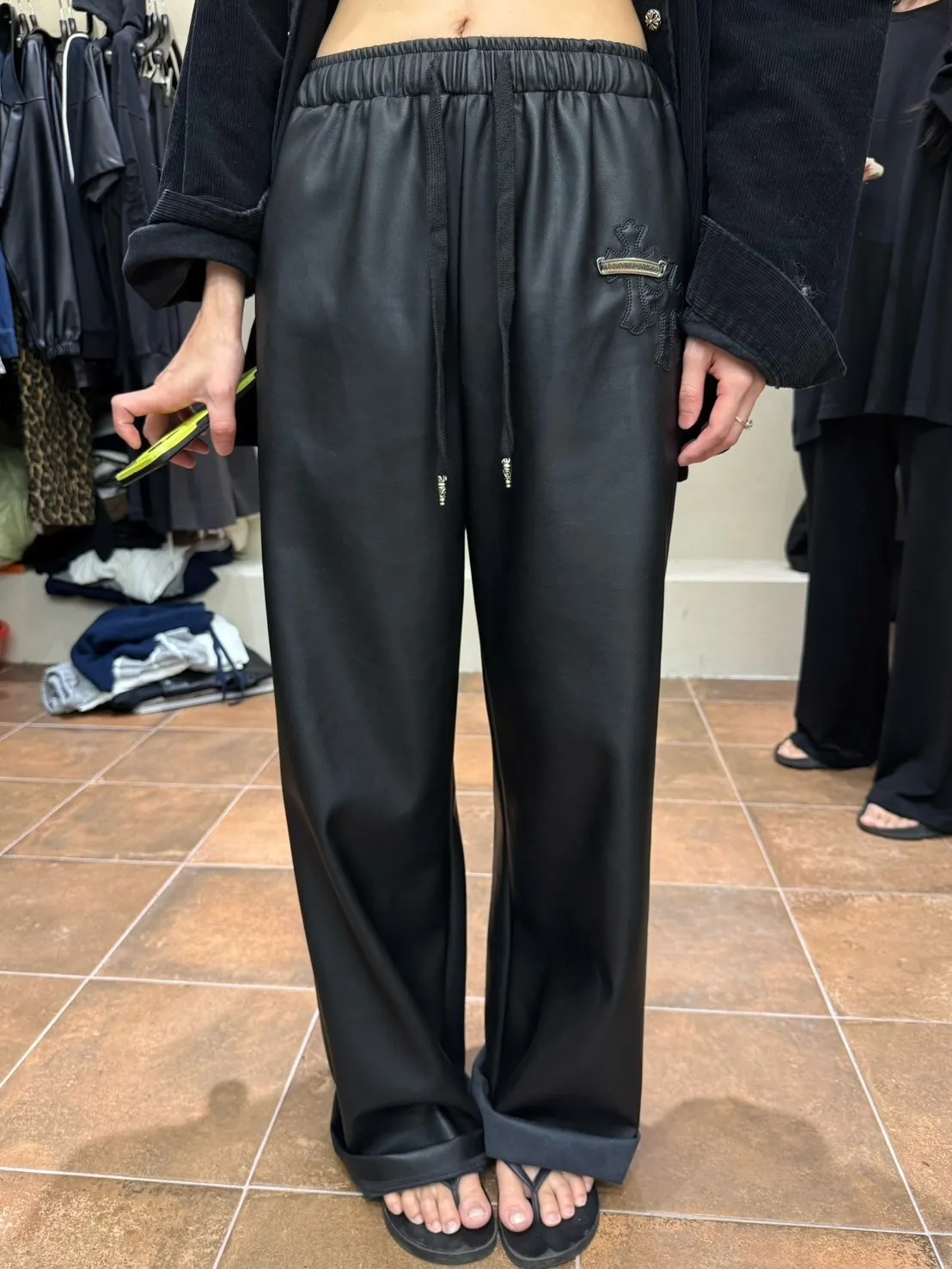韓國製🇰🇷十字架質感皮革薄刷毛寬褲
