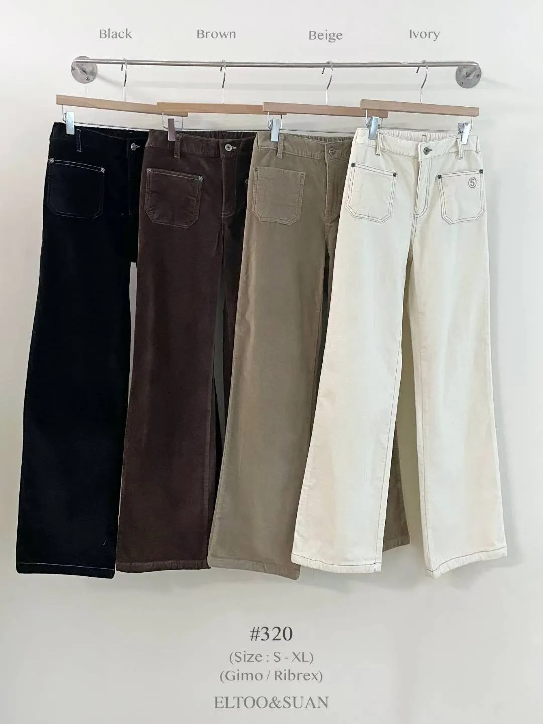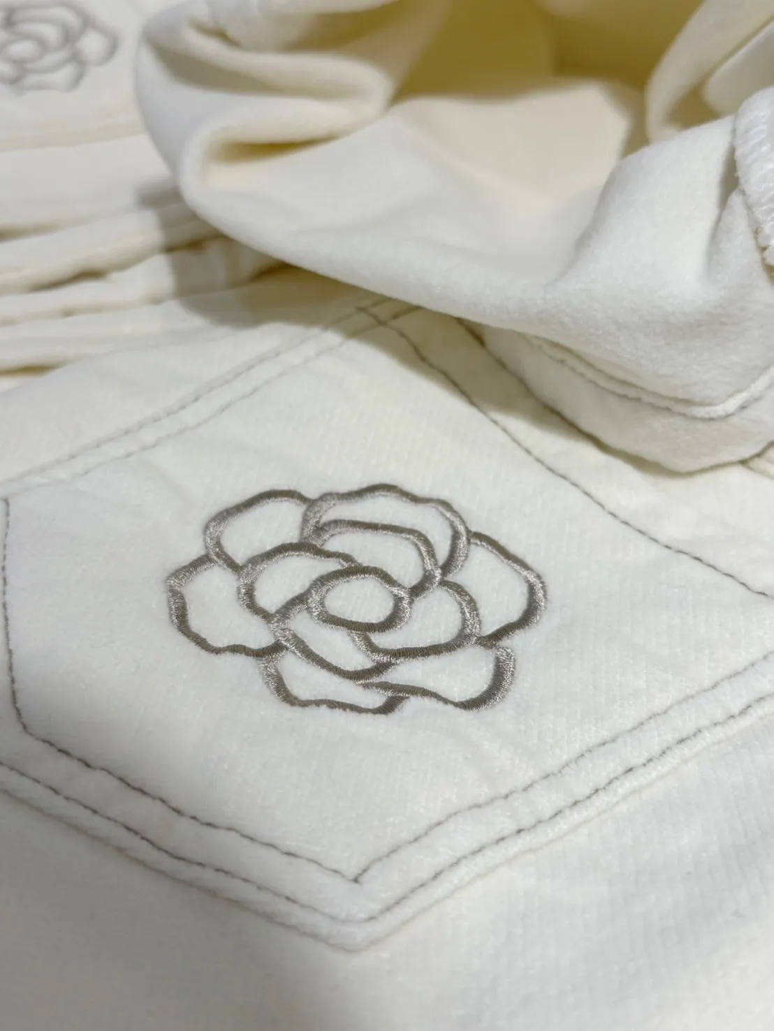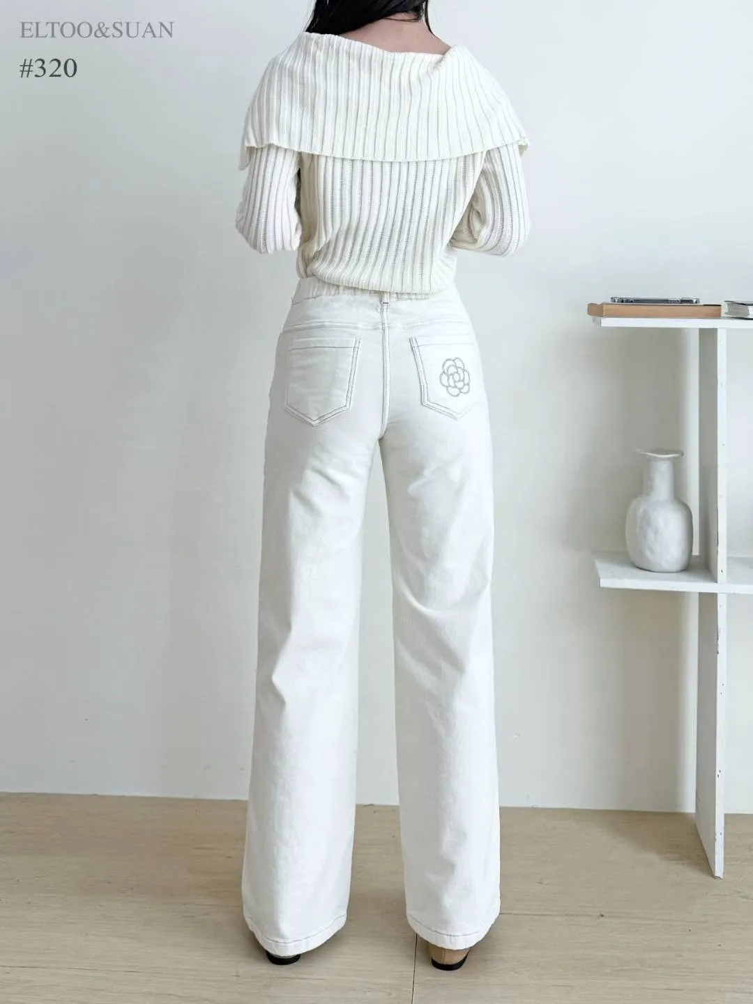 韓國製🇰🇷刺繡山茶花磨毛直筒刷毛寬褲
