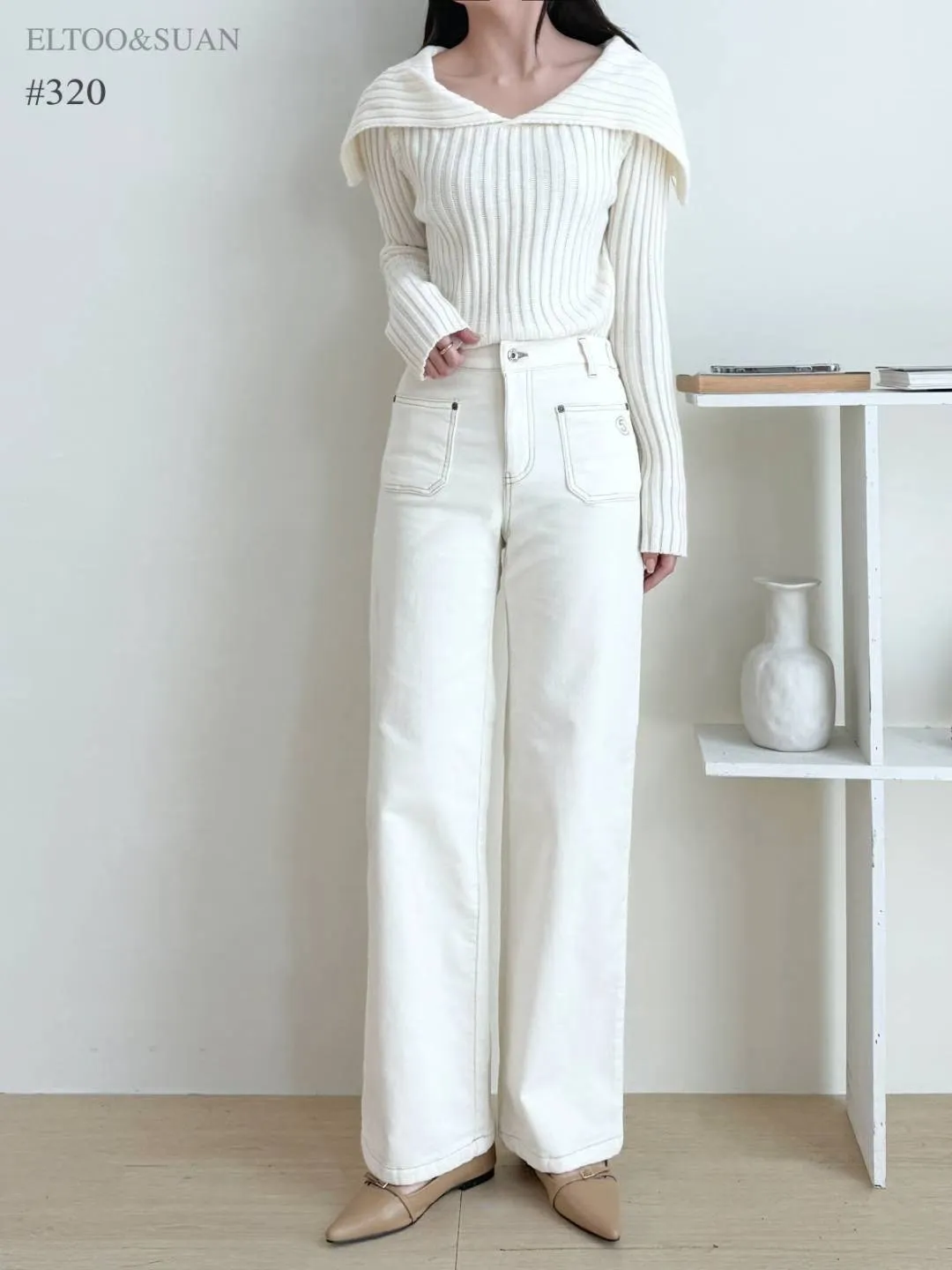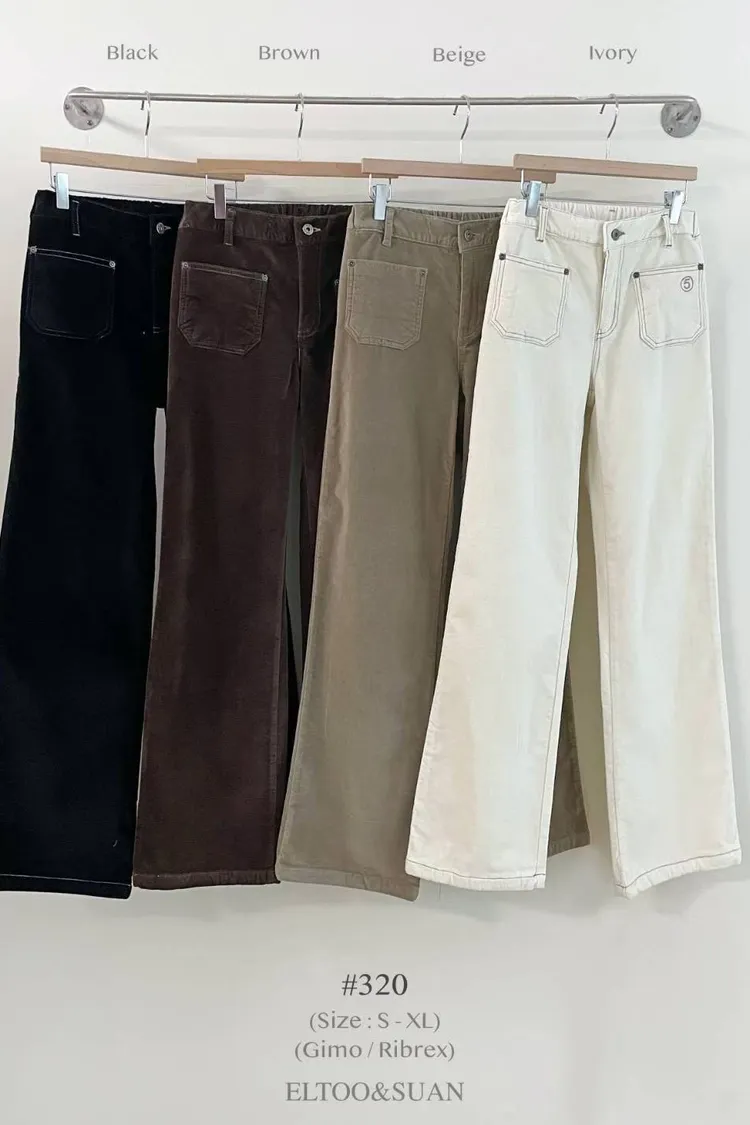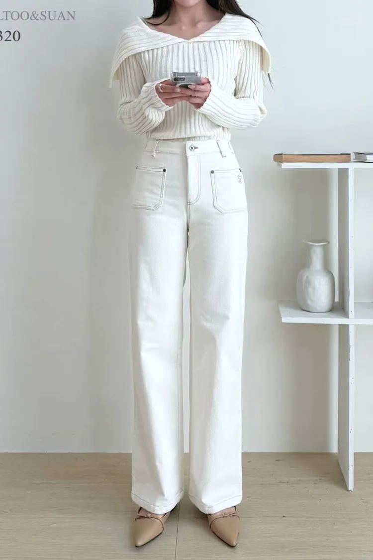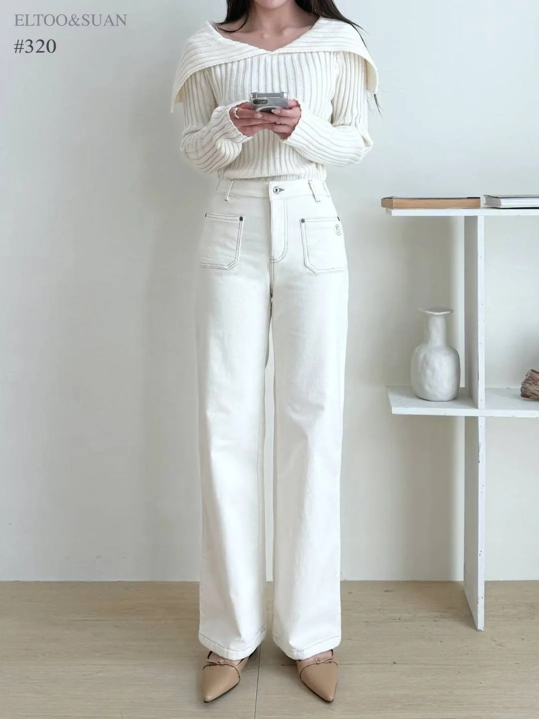 韓國製🇰🇷刺繡山茶花磨毛直筒刷毛寬褲