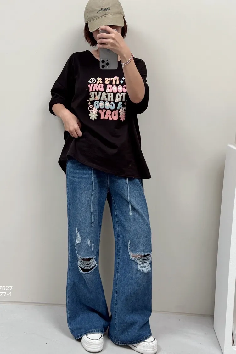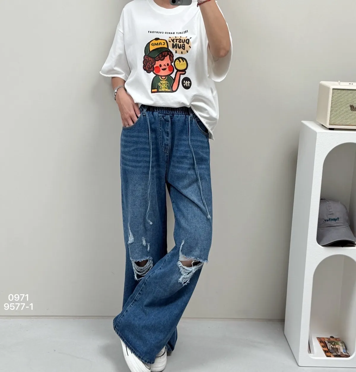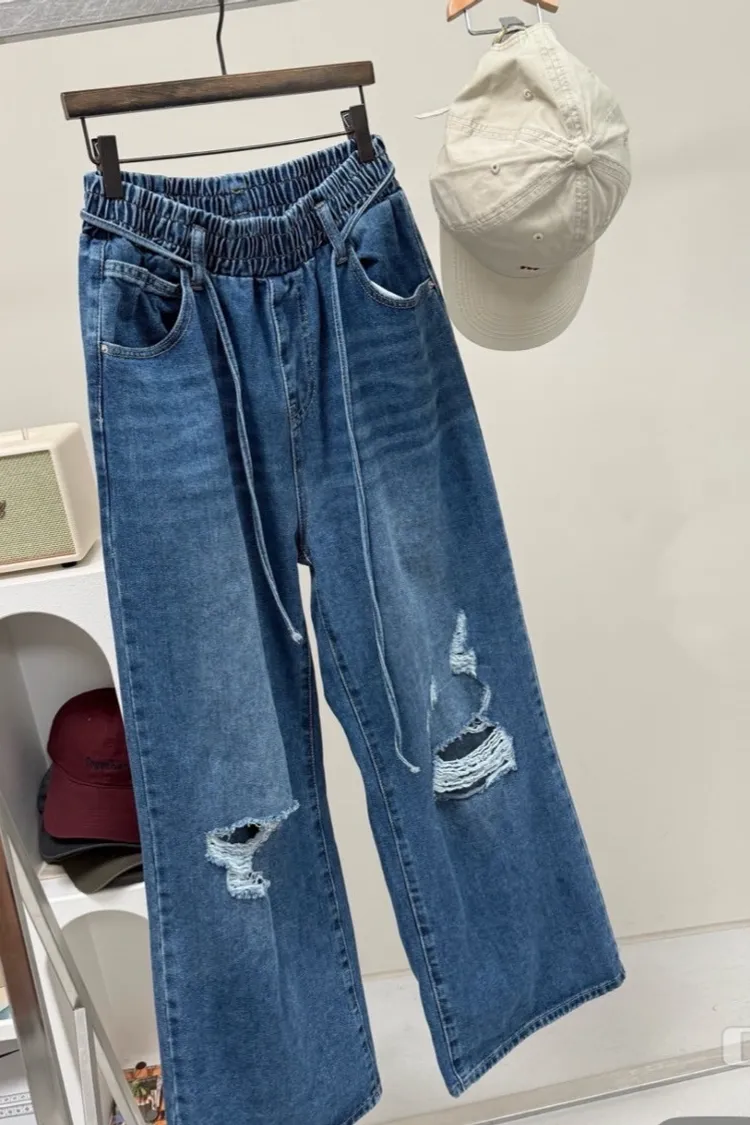 韓國製🇰🇷抽繩牛仔破損寬褲