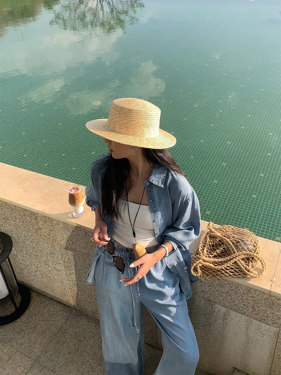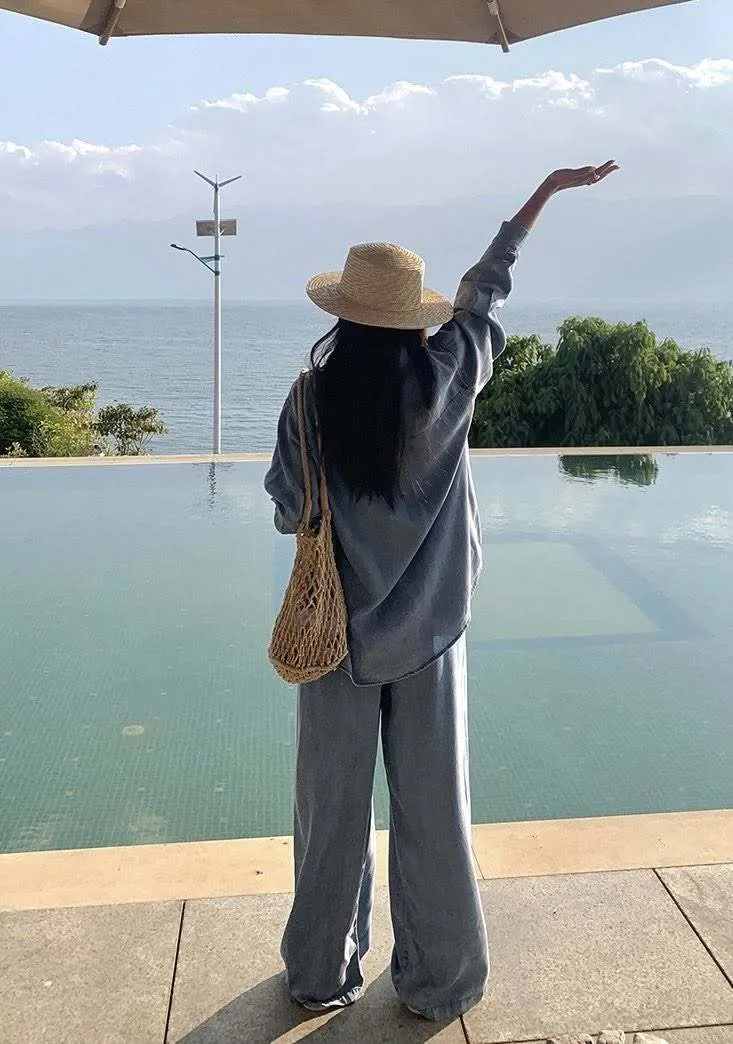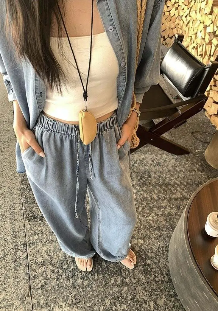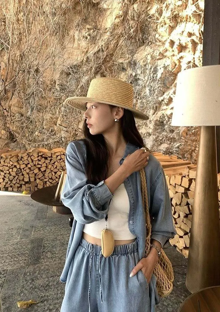 走進春夏的微風裡 輕柔又率性的牛仔套裝! 天絲棉材質涼爽親膚 寬鬆剪裁讓每一步都自在灑脫 簡約襯衫上衣+闊腿抽繩褲 穿出慵懶隨性的度假感 搭配草帽、編織包就能輕鬆駕馭森林系穿搭 是你週末小旅行的命定OOTD! 材質:天絲棉
