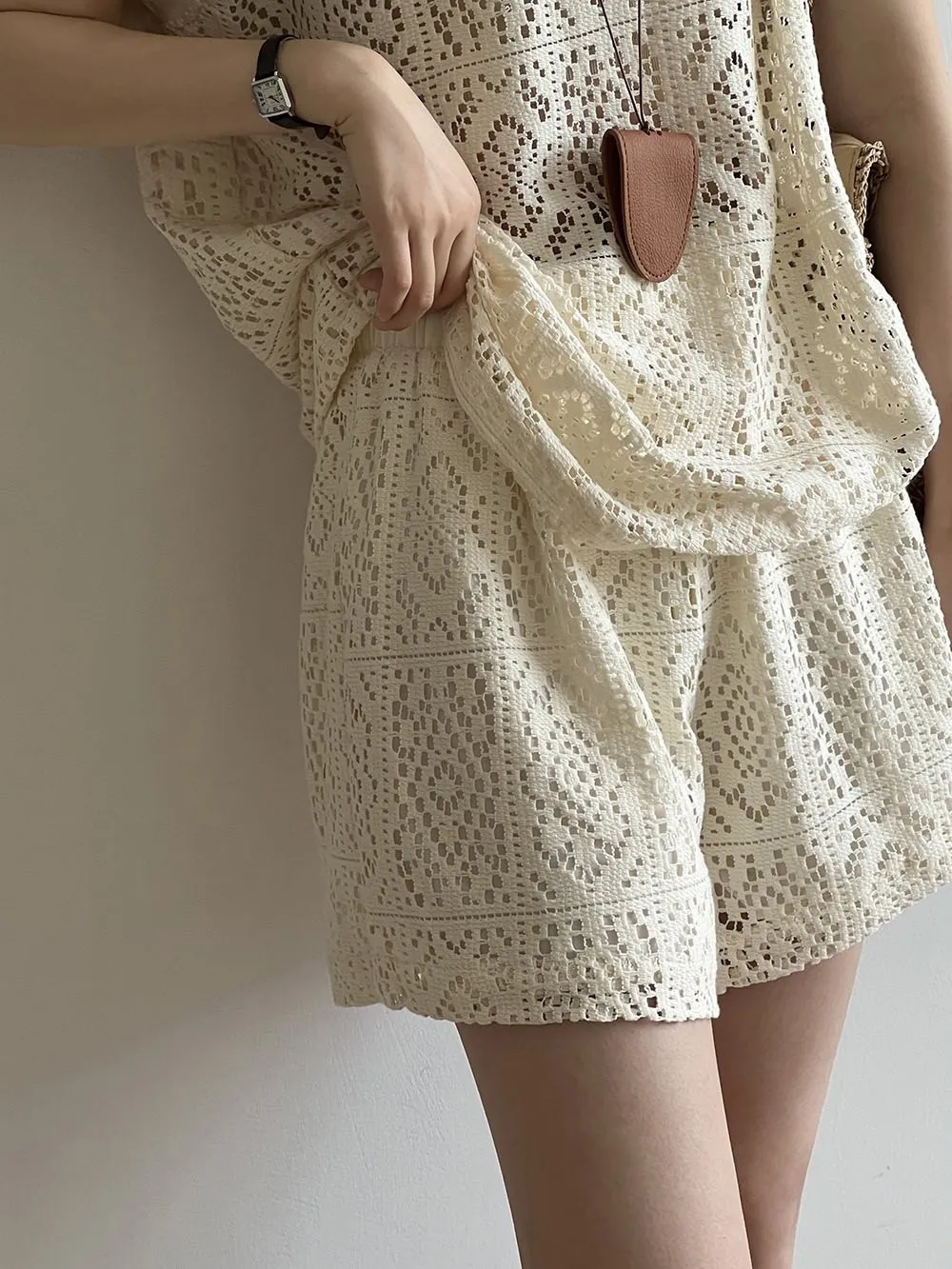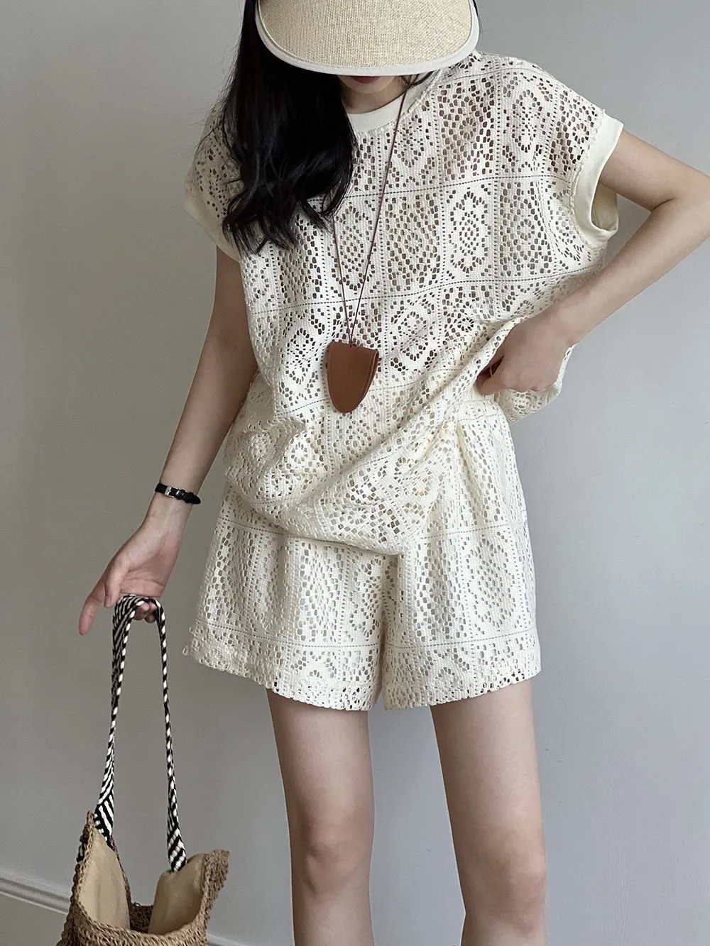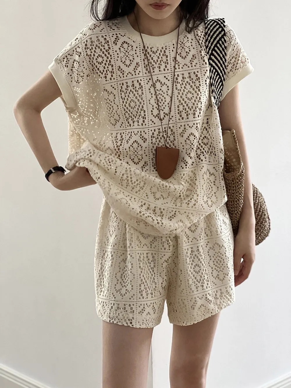 【夏日微光】鏤空蕾絲套裝(上衣+短褲)