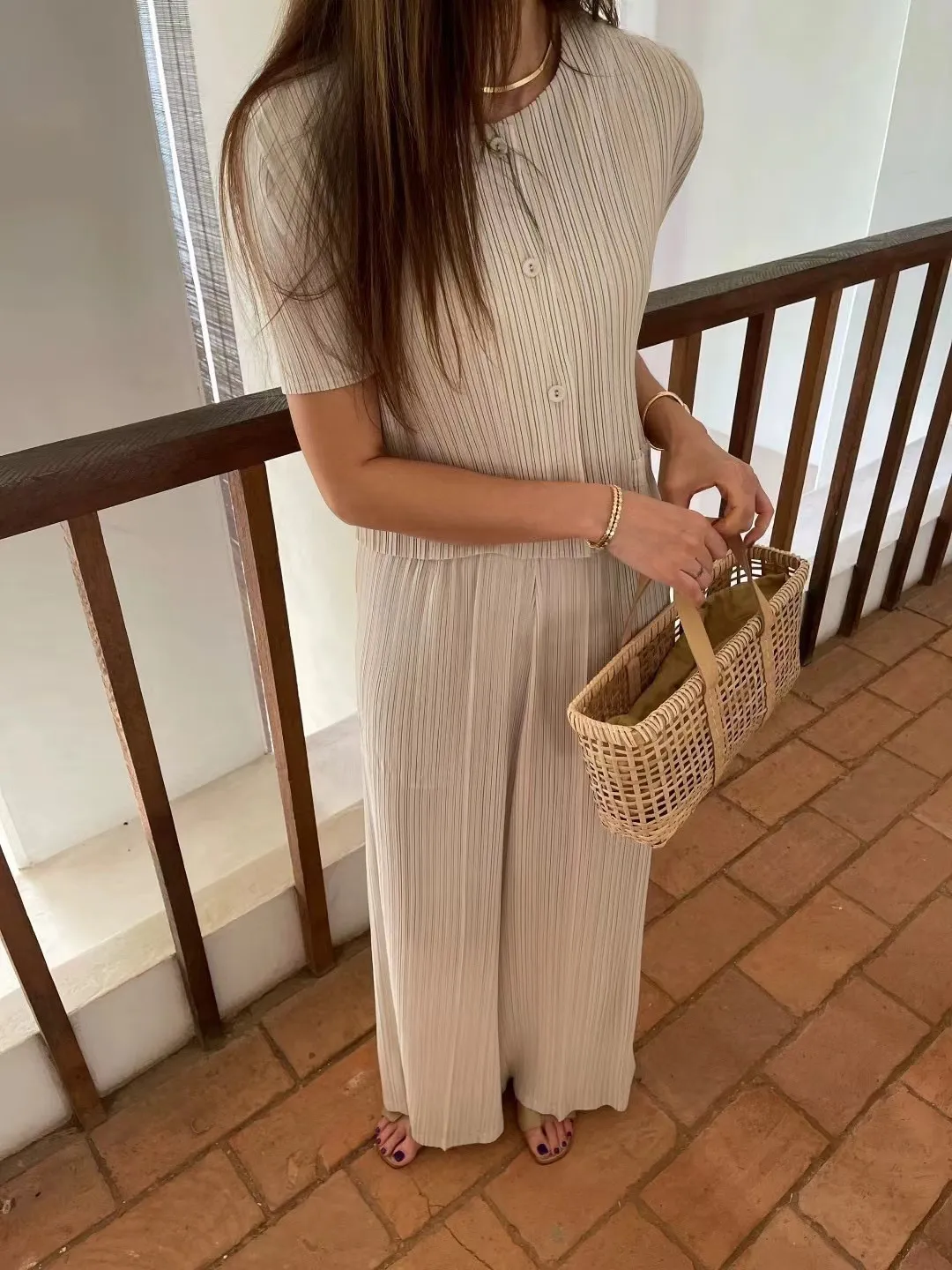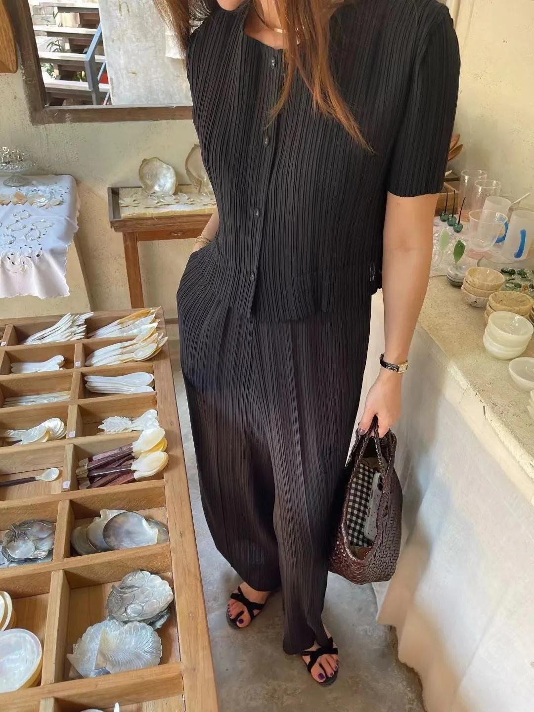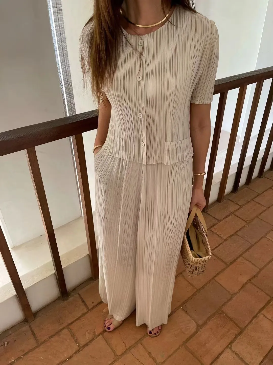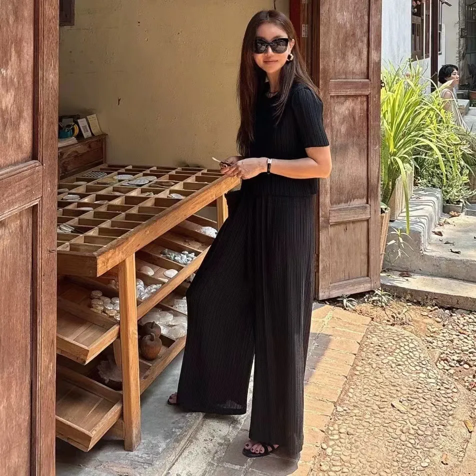 一套就搞定出門穿搭小煩惱~超顯氣質的竪褶紋理,輕柔涼感、不貼身版型 寬鬆不顯胖上衣+闊腿褲的完美組合,F可穿至L號沒問題!遮肉又修身出門旅遊、上班通勤都超好穿!黑色的神秘優雅杏色的溫柔小姊姊風兩色都好難選啦~直接包色吧!