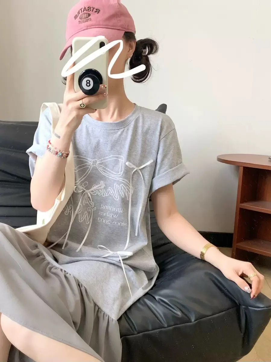 日常想穿得舒服又不失可愛感? 這件幫你搞定Tee版洋裝+下擺雪紡網紗拼接,柔柔甜甜又不黏身正面蝴蝶結線條印花,整體氛圍感直接拉滿!寬鬆剪裁不挑身形,單穿、內搭、出遊、追劇都超可以!配球鞋就是韓系學院風,戴頂棒球帽更俏皮