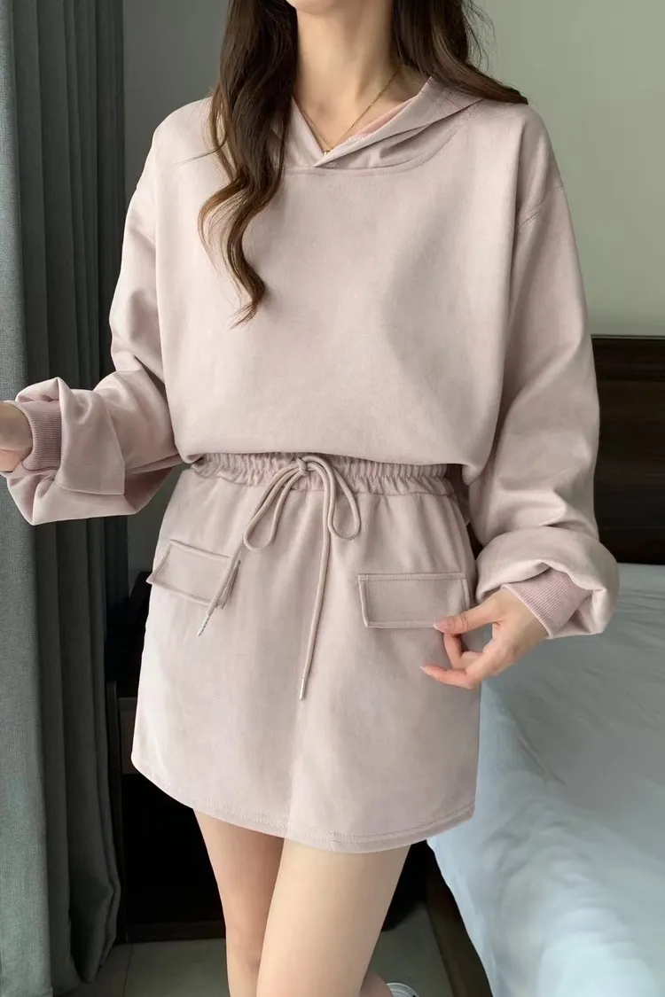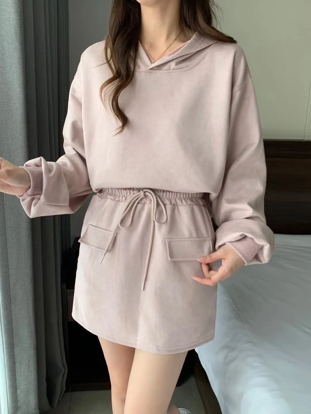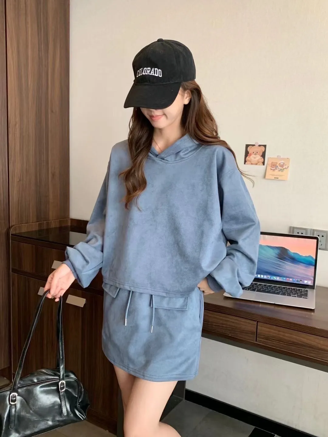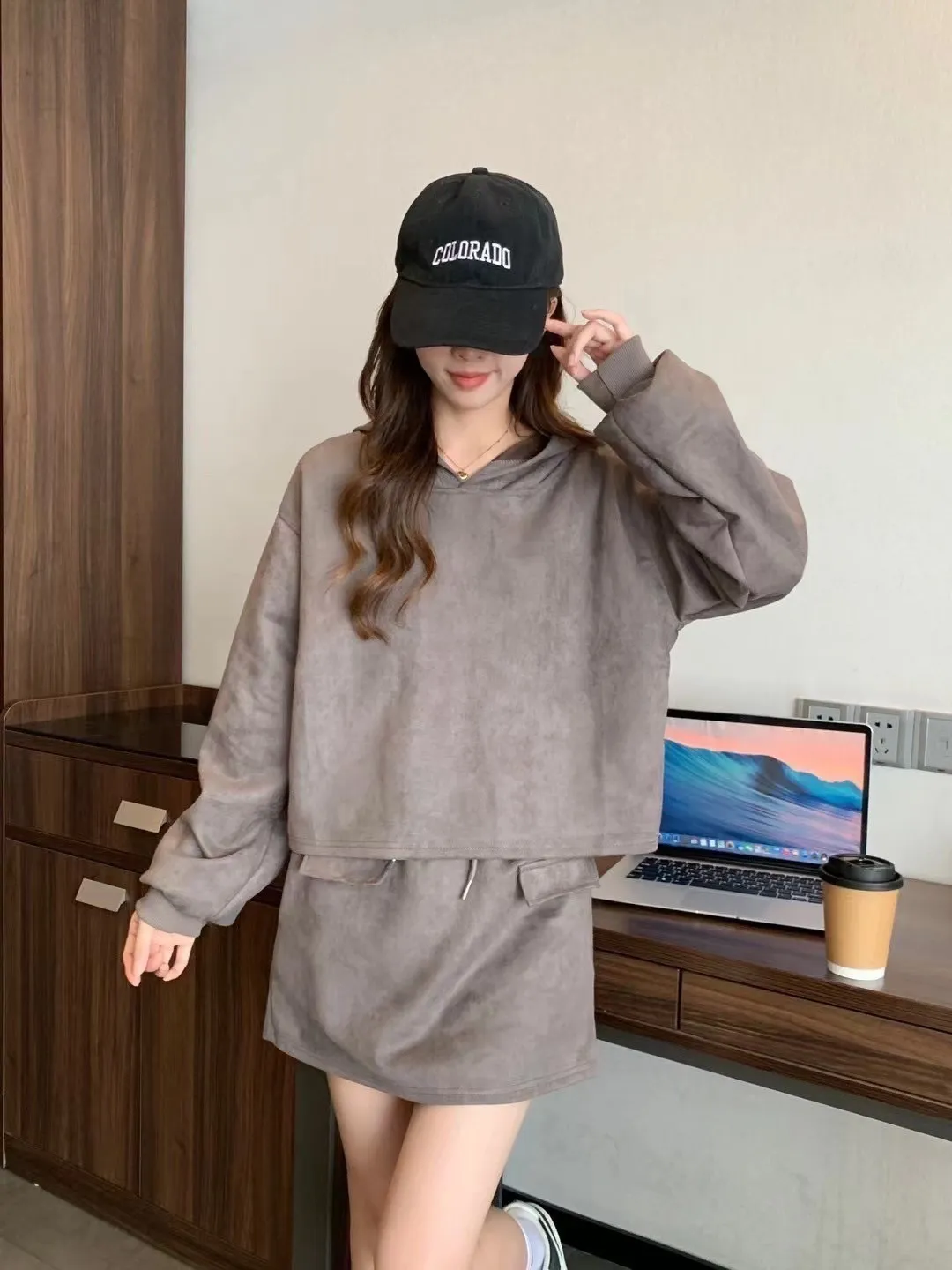 【柔霧軟糯】麂皮絨連帽短版上衣+褲裙套裝