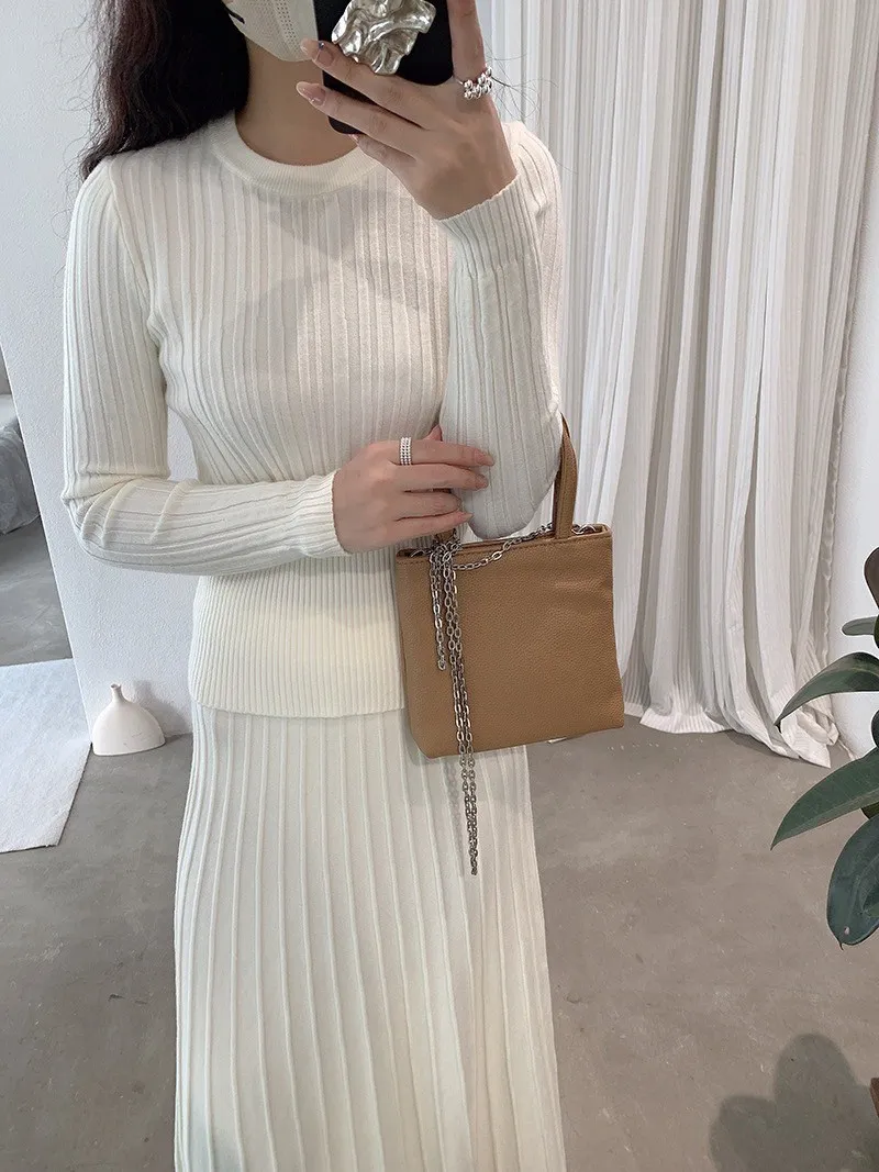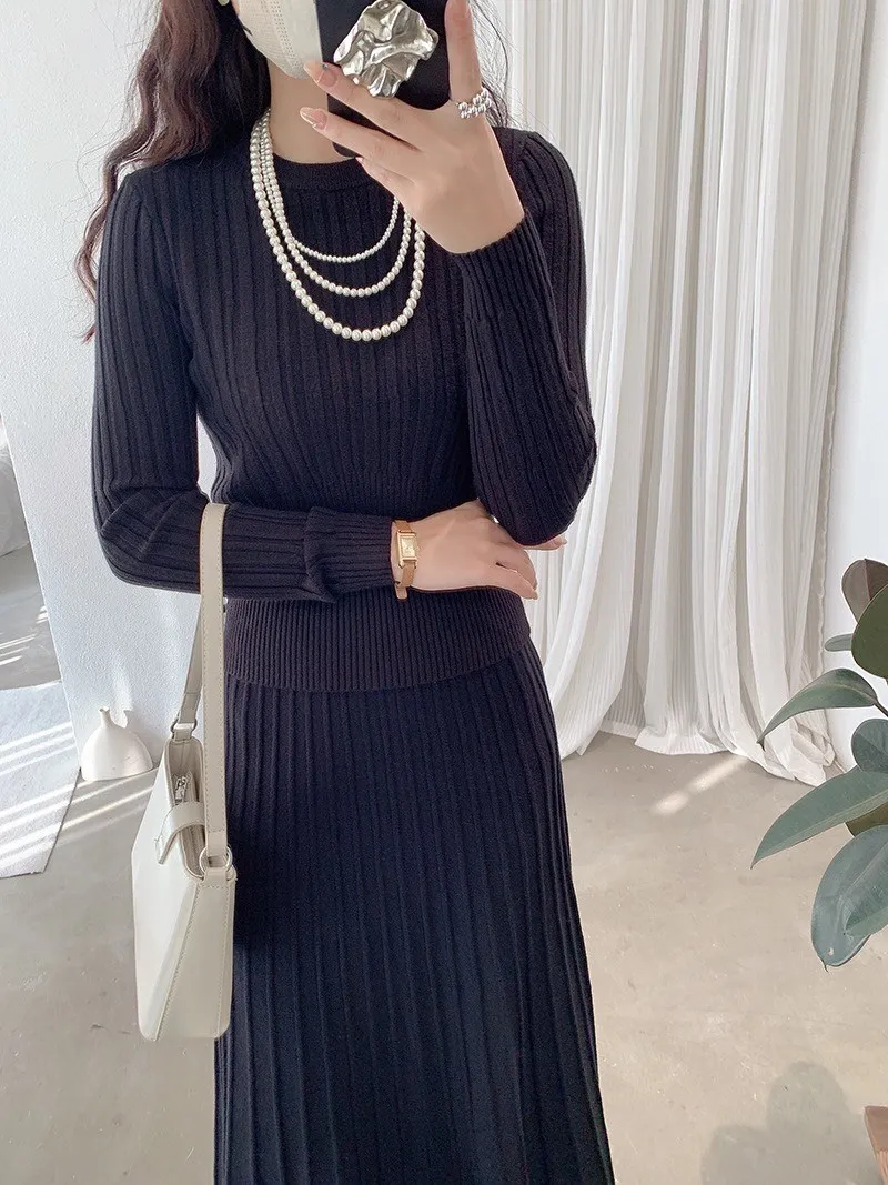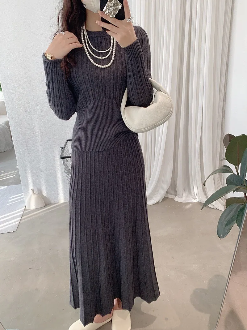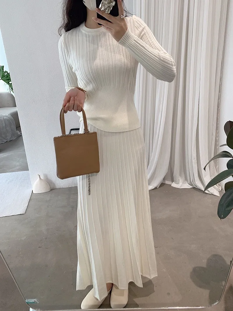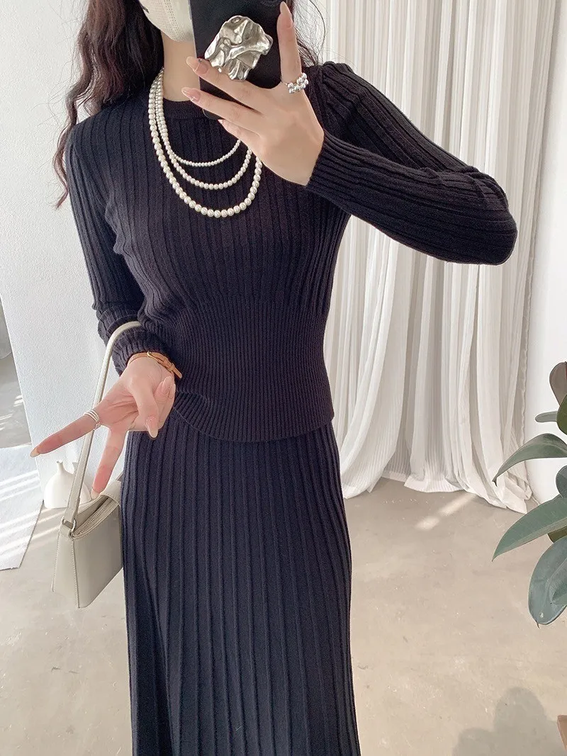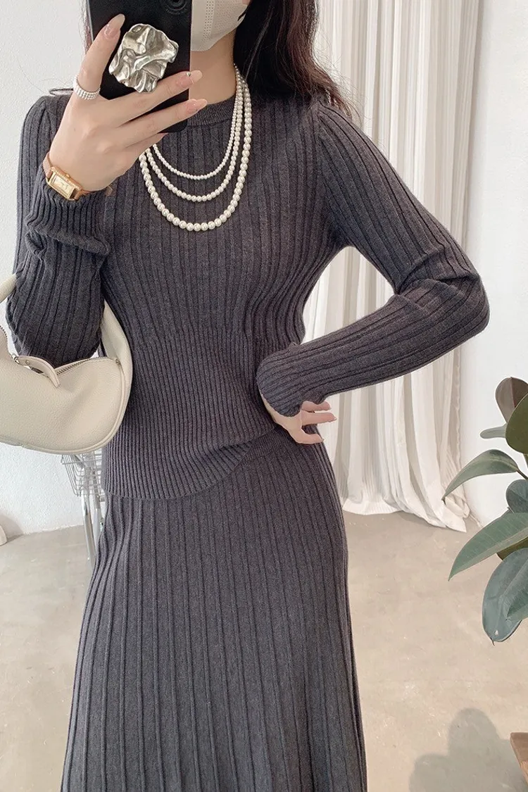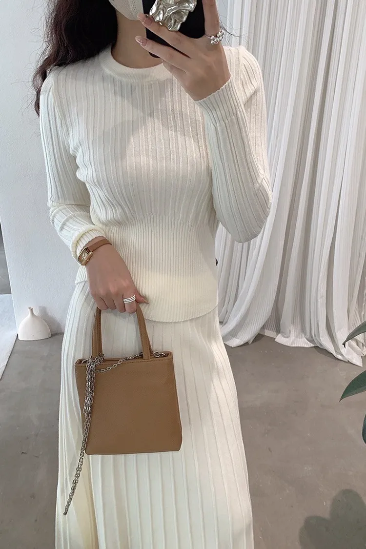 【線條輕裁】簡約收腰顯瘦設計感針織衫+半身裙兩件套