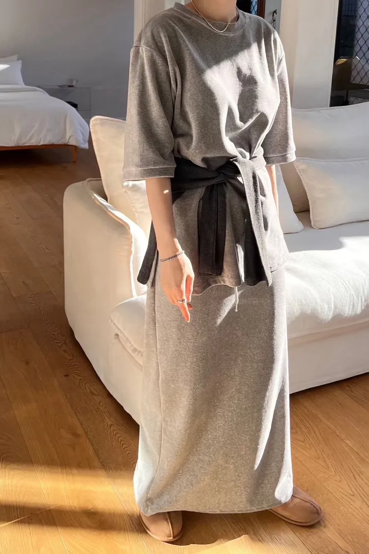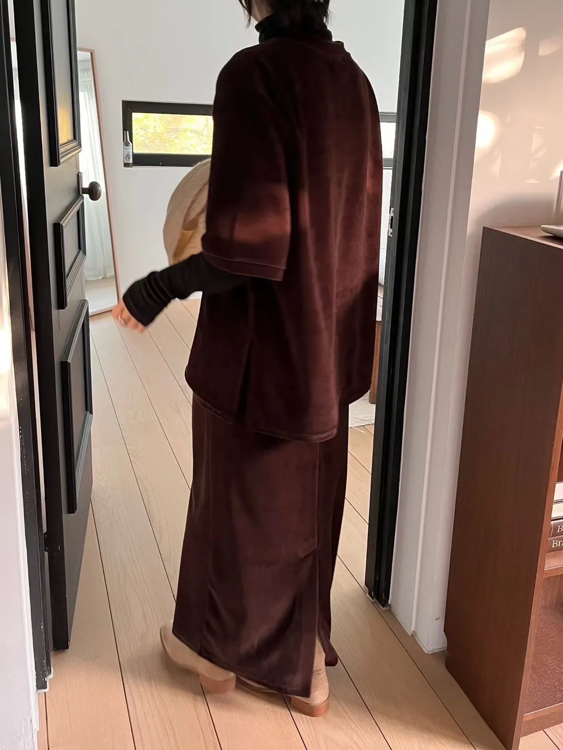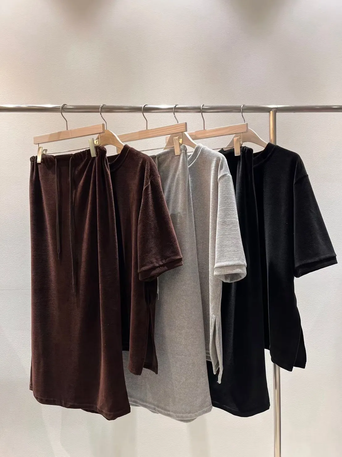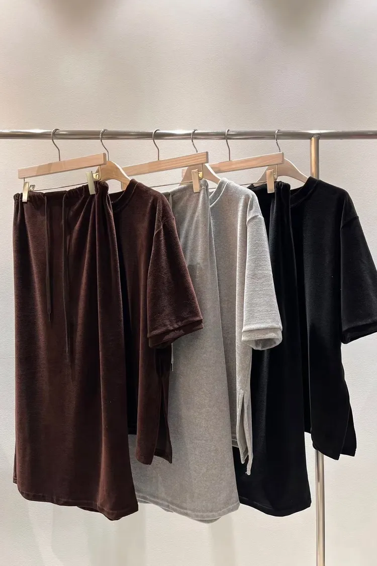 韓國製🇰🇷柔霧絨光短袖絨上衣+長裙套裝