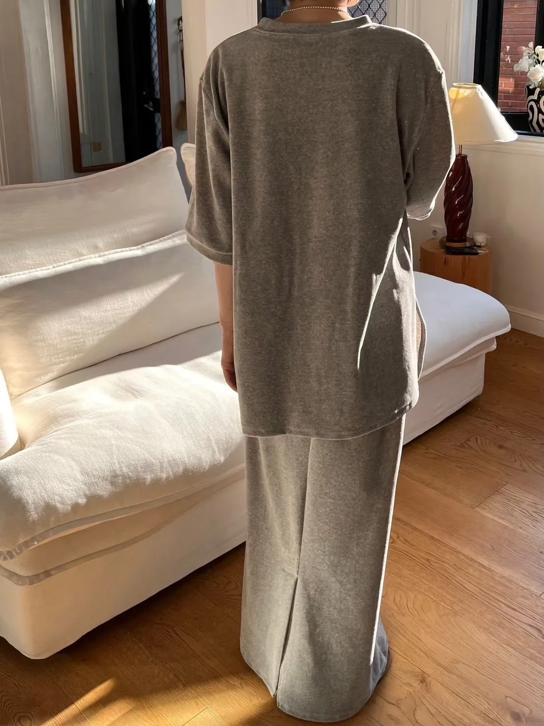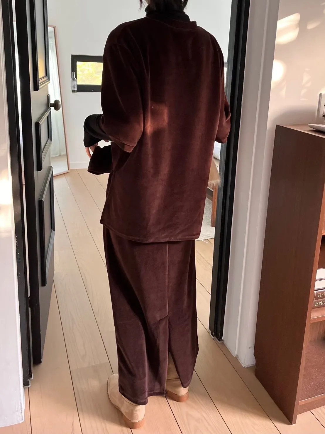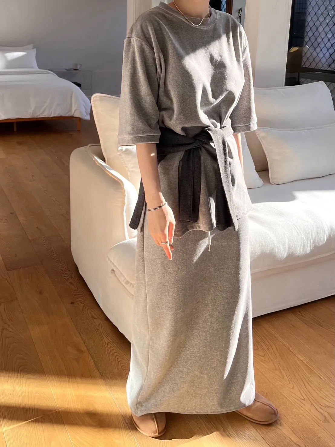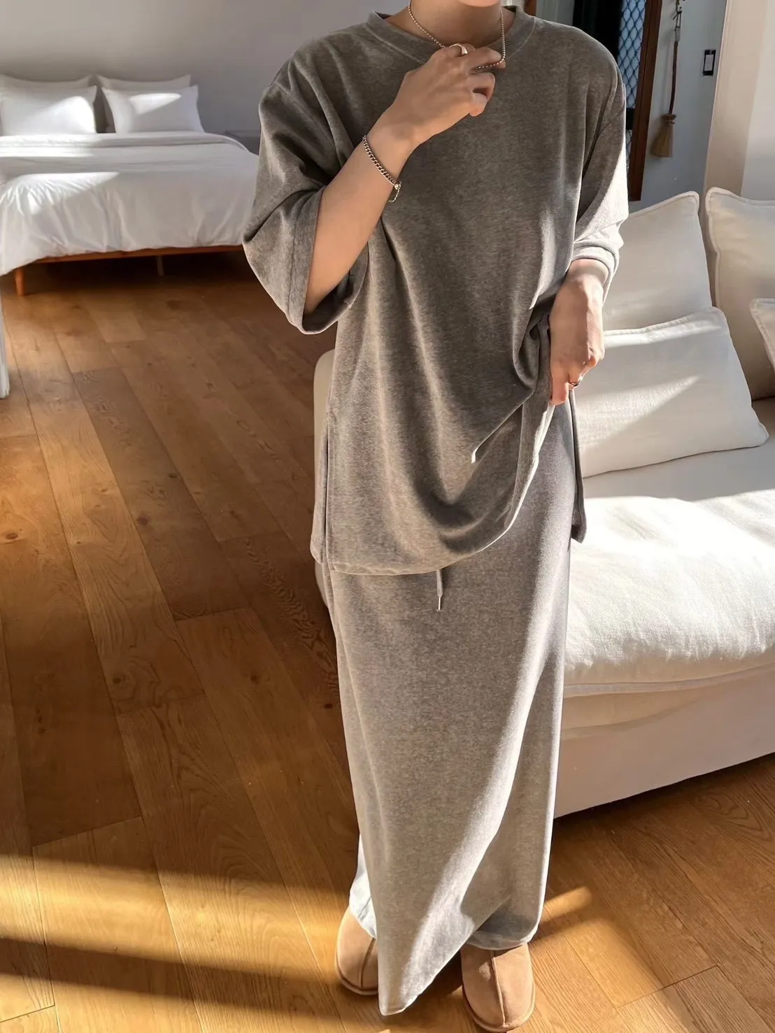 韓國製🇰🇷柔霧絨光短袖絨上衣+長裙套裝