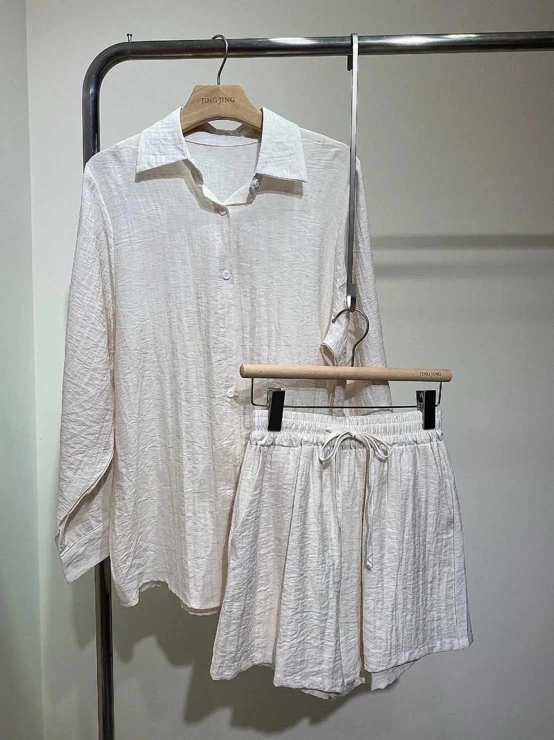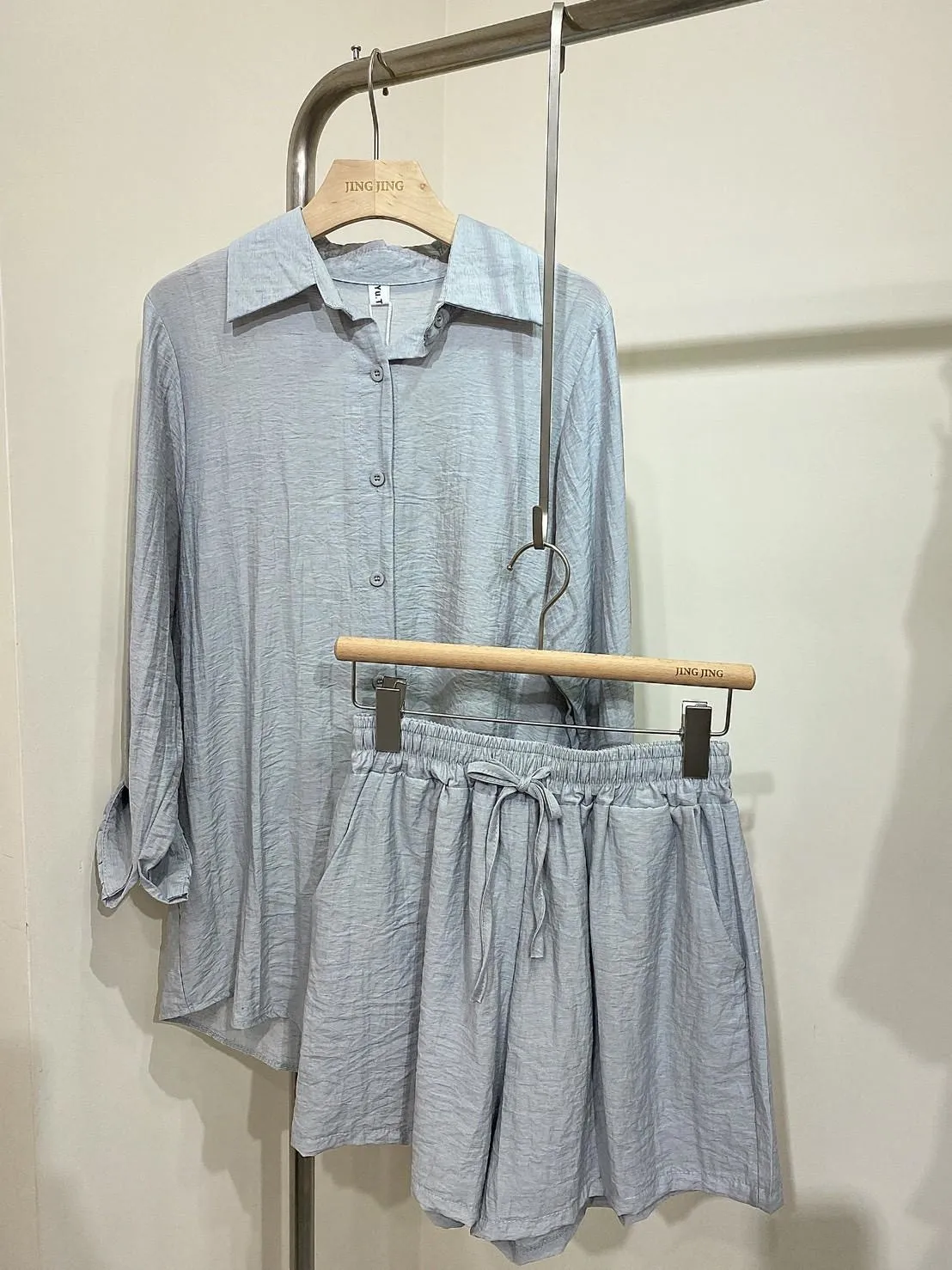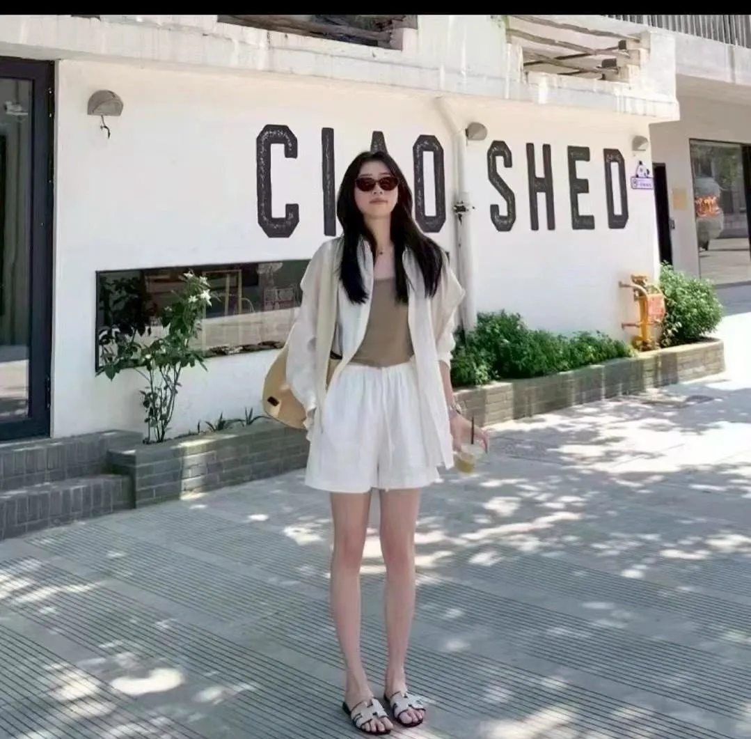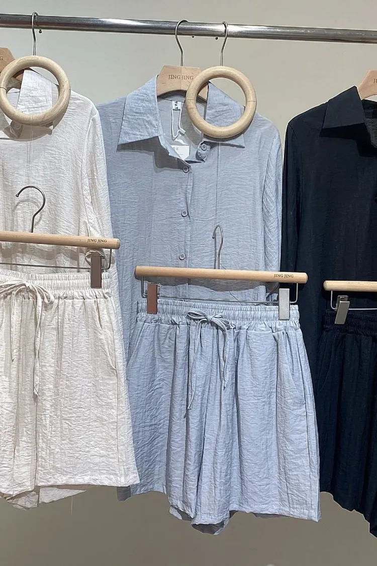 極簡優質棉麻抽繩短褲套裝(襯衫+短褲)
