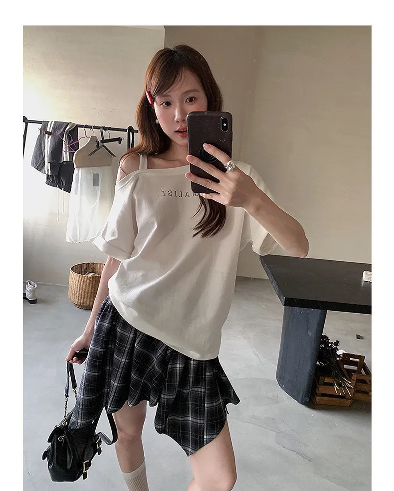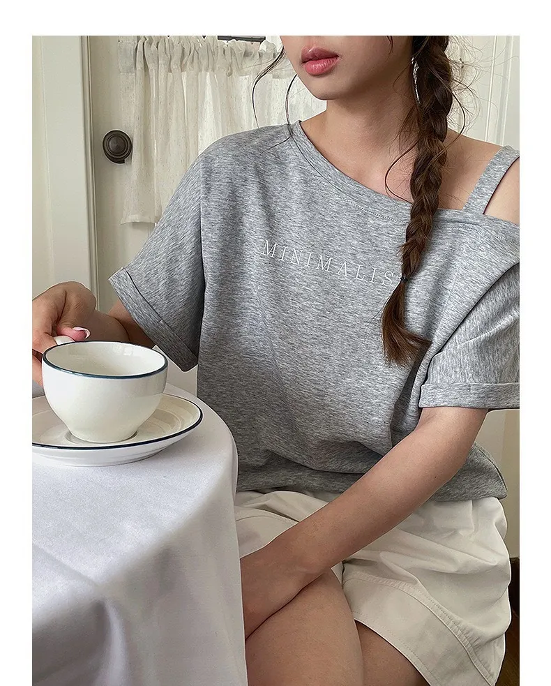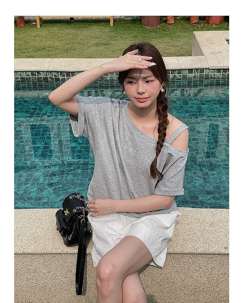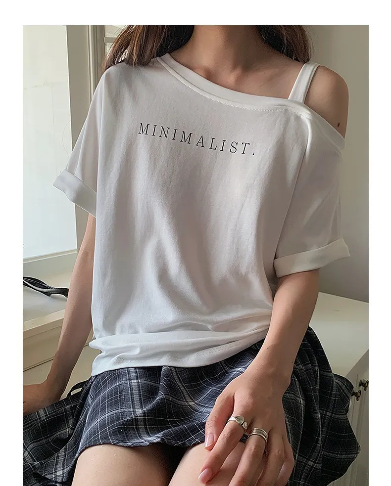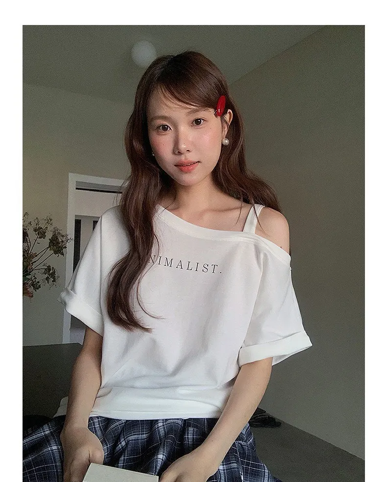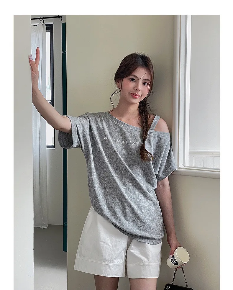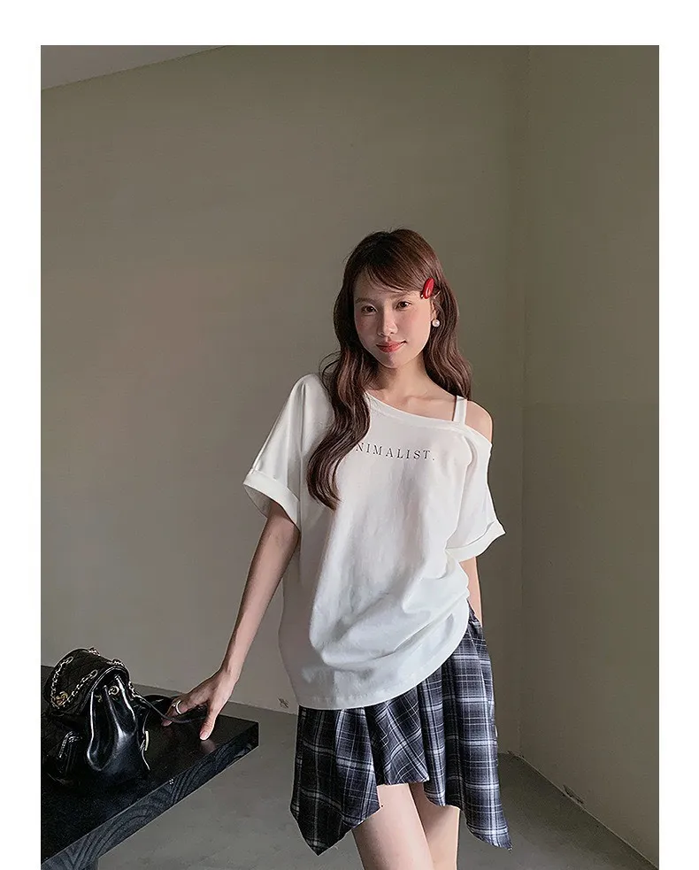 設計感字母斜肩上衣