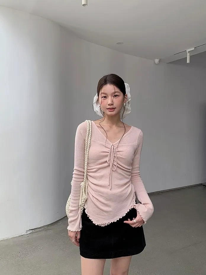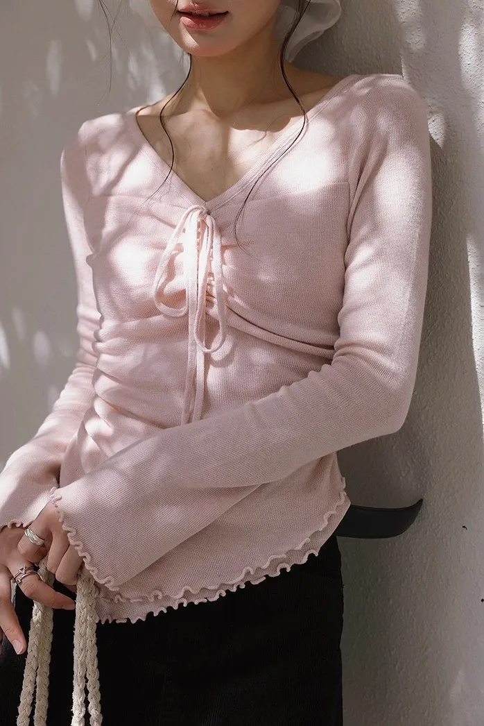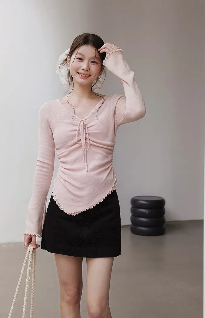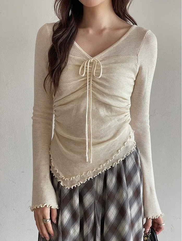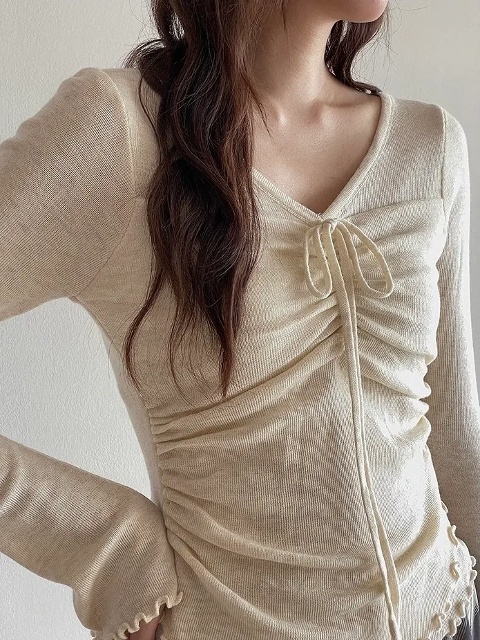 【雲釀雪葩】優雅木耳邊復古褶皺針織上衣