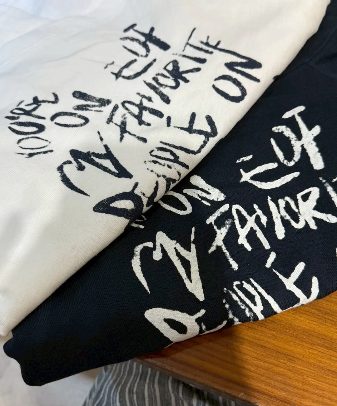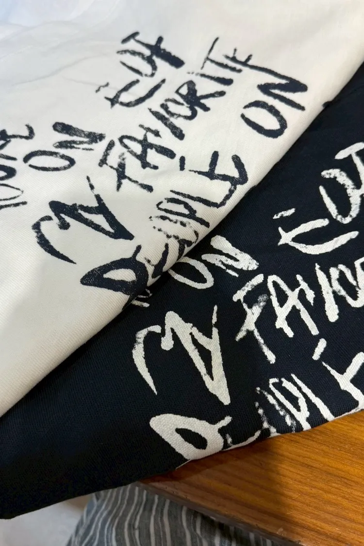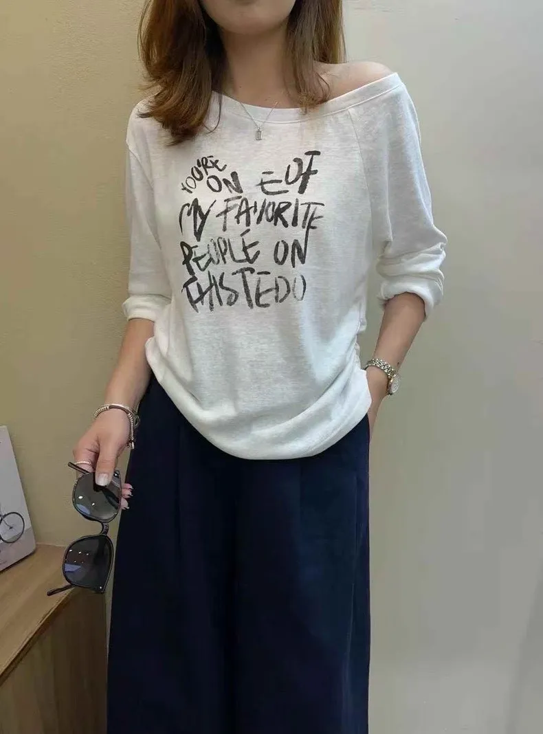 韓國製🇰🇷手寫字母不對稱露肩側皺雪花棉上衣
