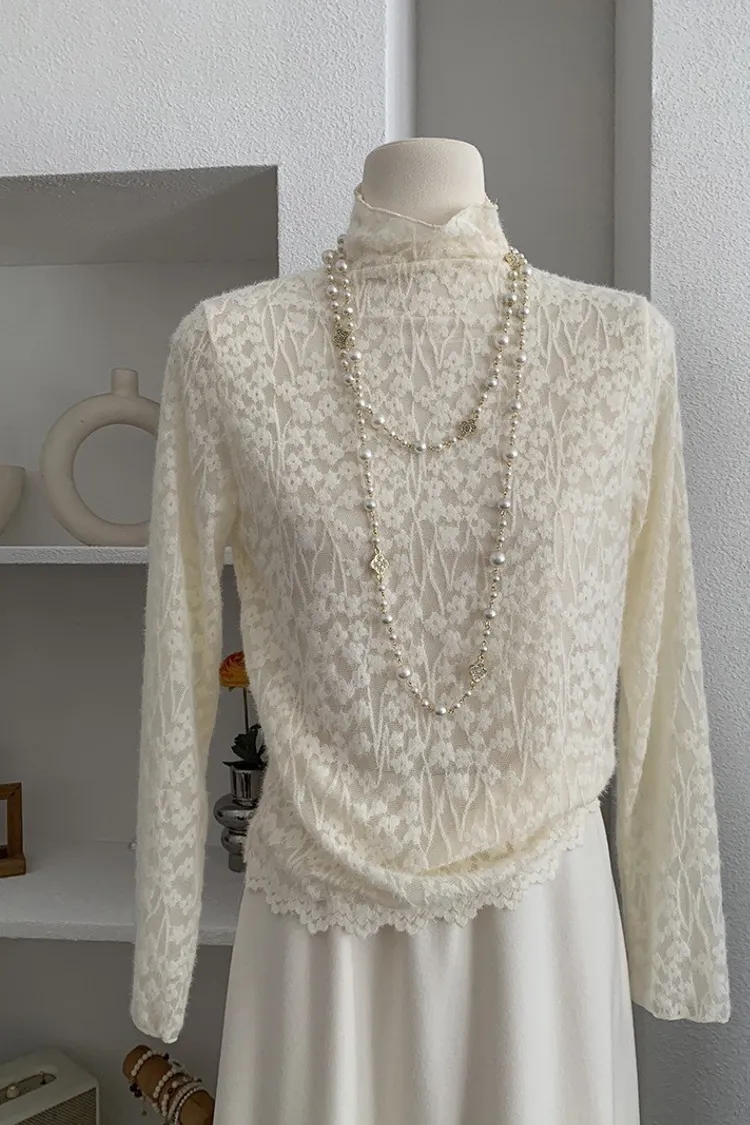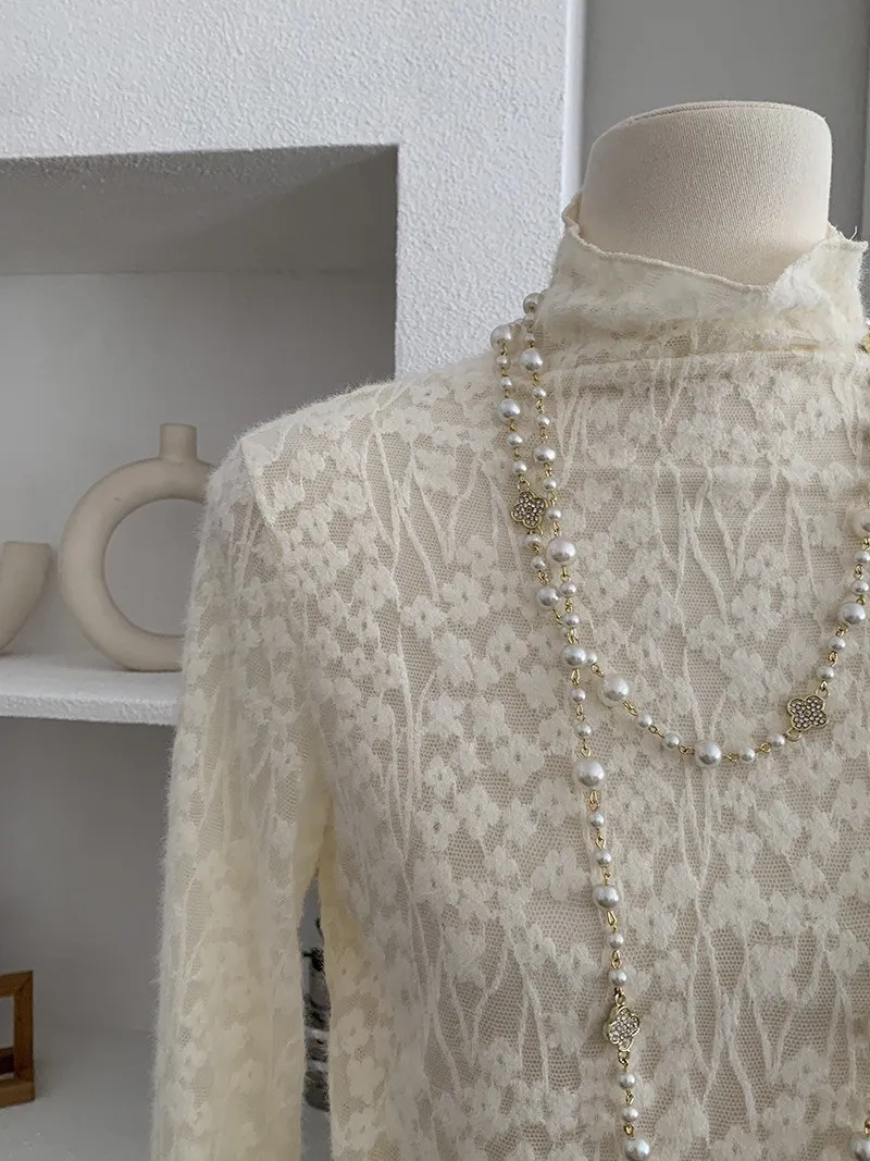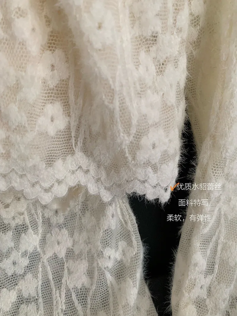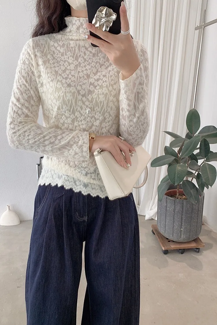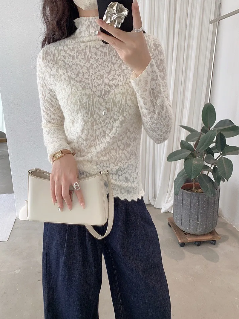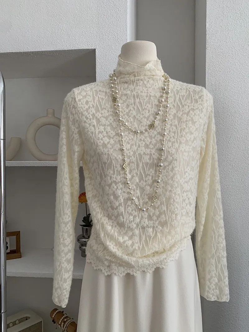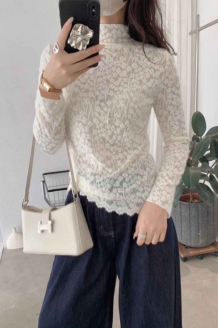 【蕾霧纖姿】純欲風高領蕾絲馬海毛顯瘦打底衫內搭