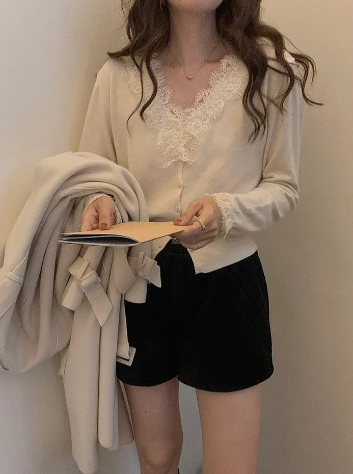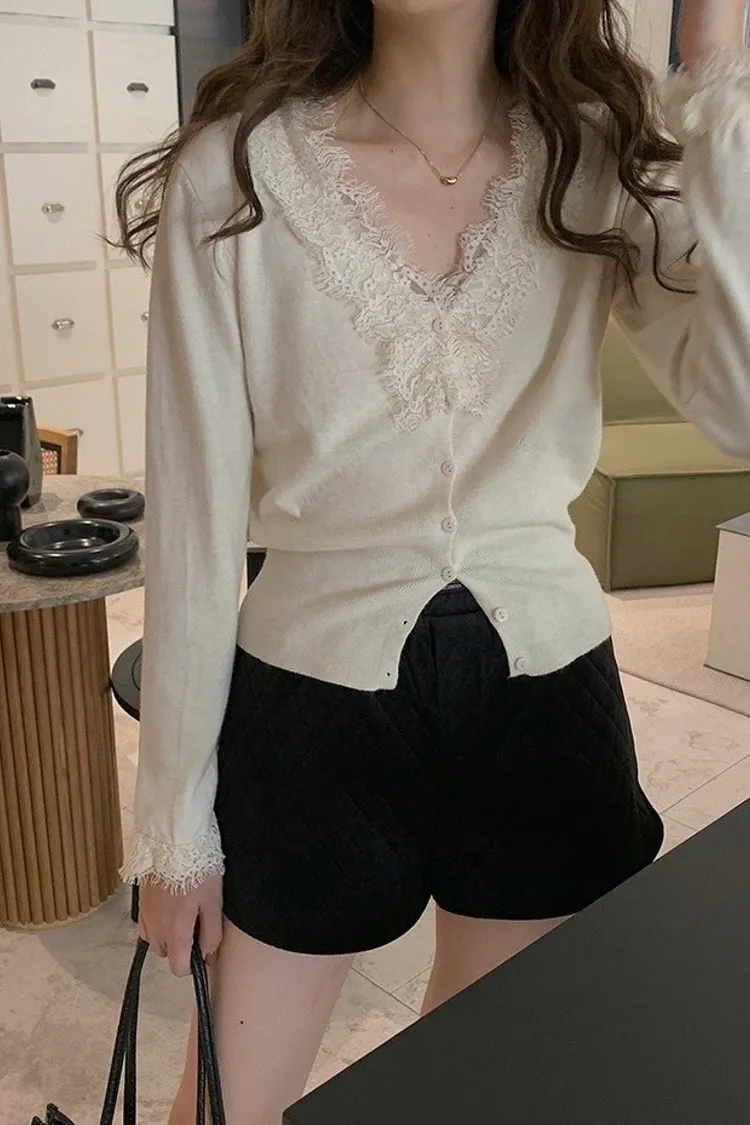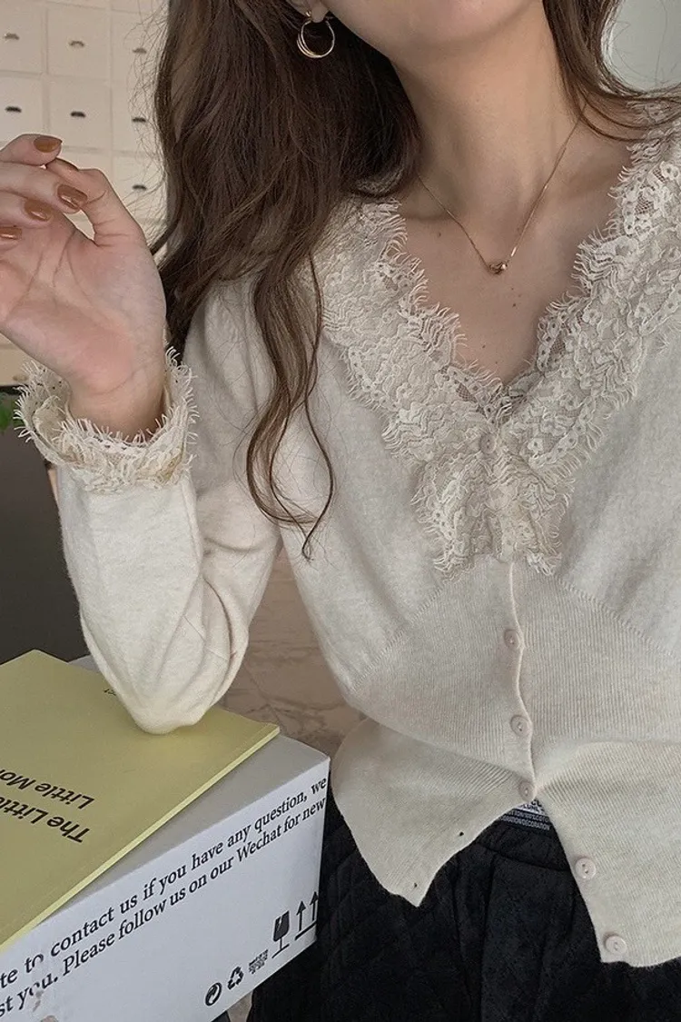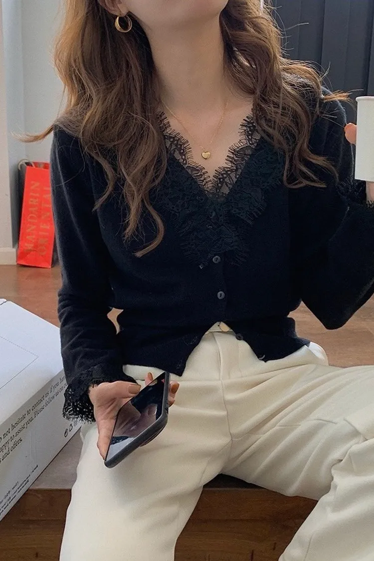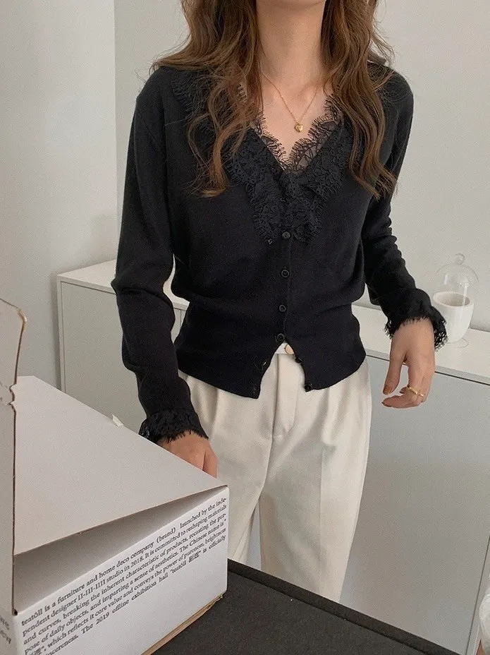 【雅蕾V織】設計感蕾絲針織V領修身氣質上衣