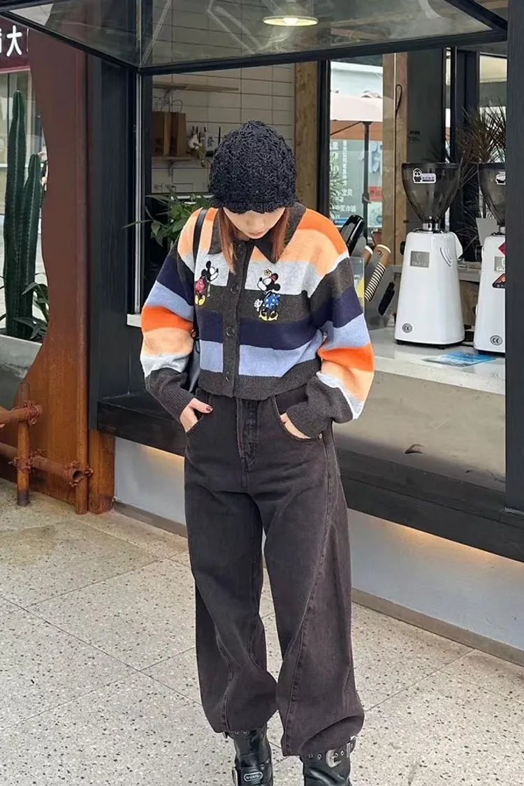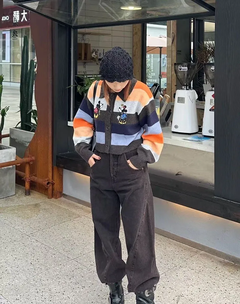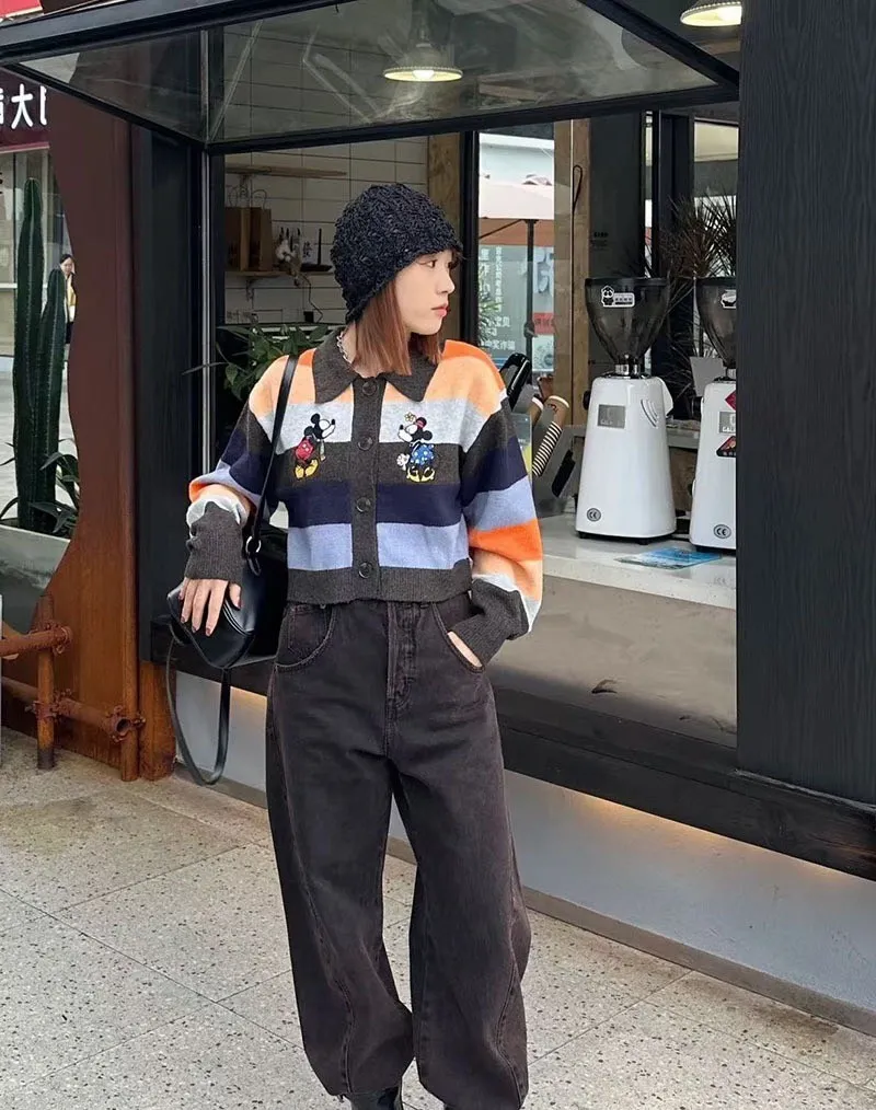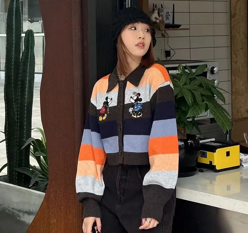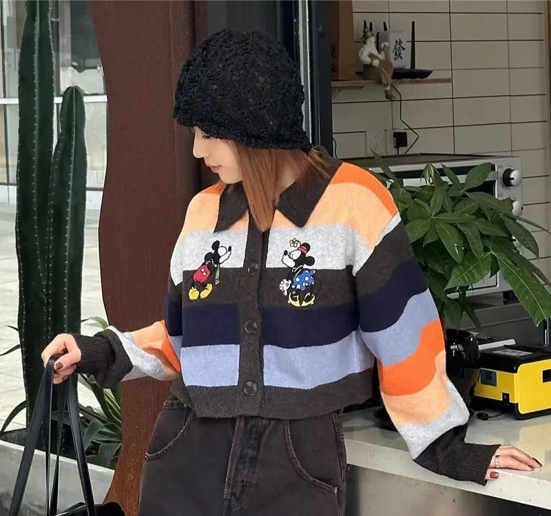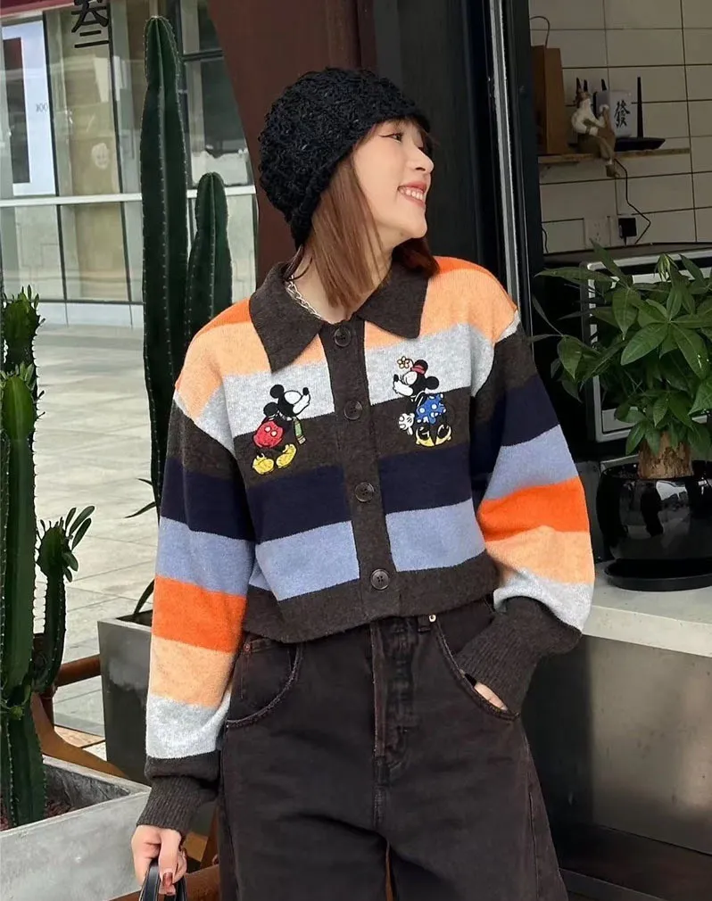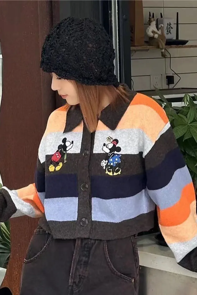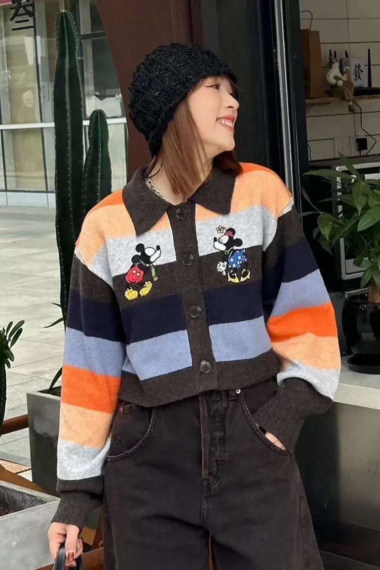 【彩映暖織】彩虹條紋刺繡卡通針織毛衣