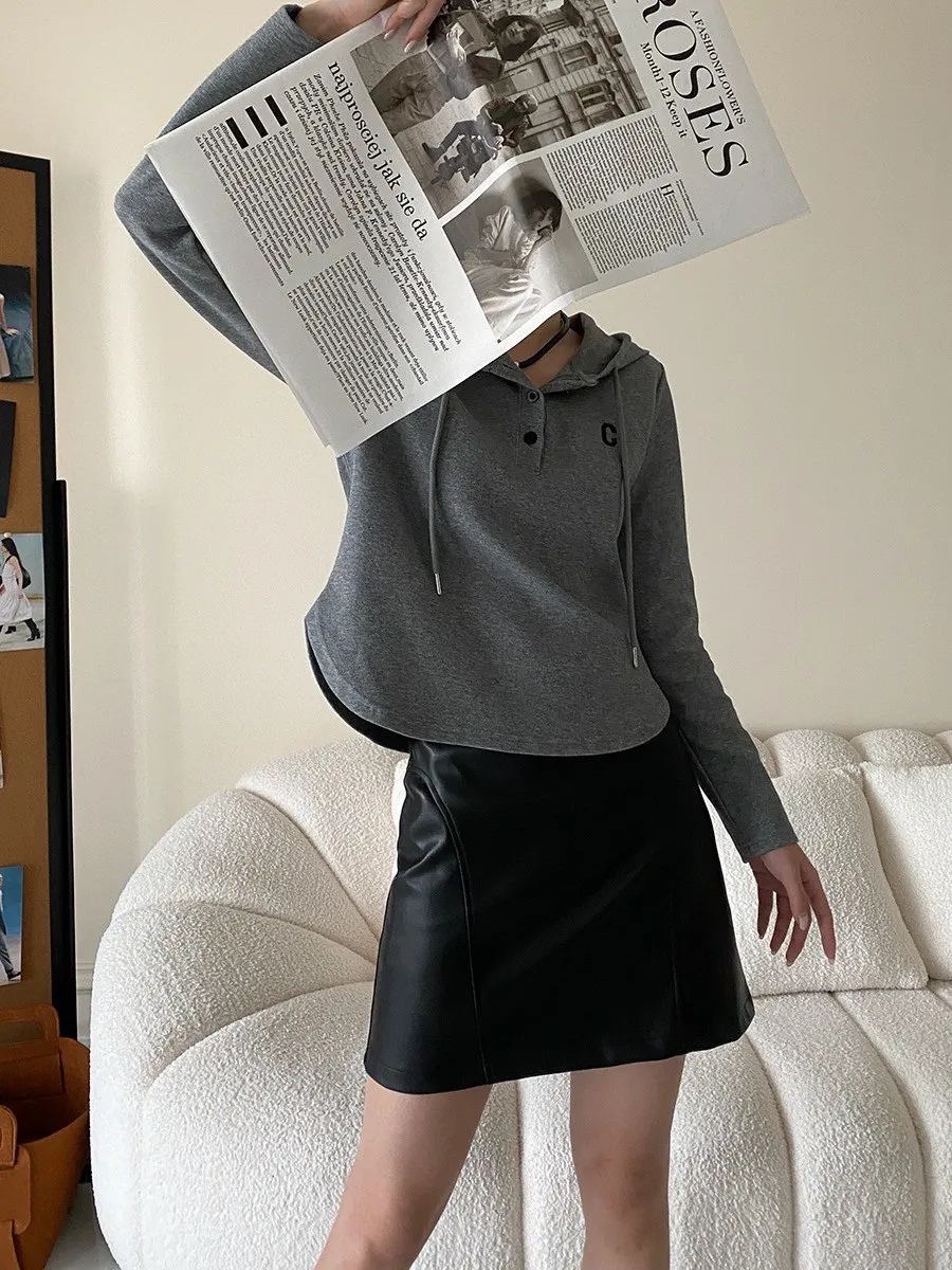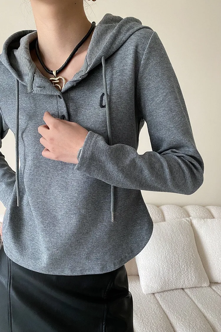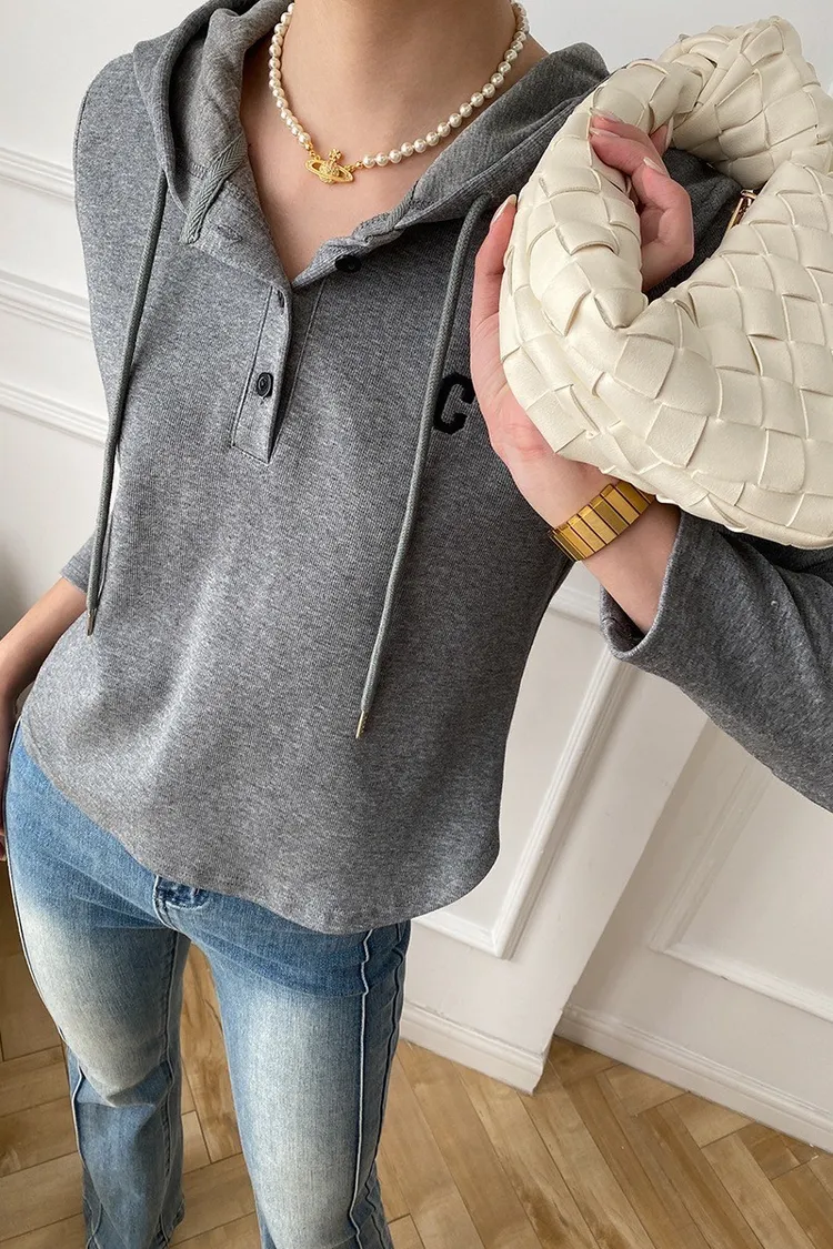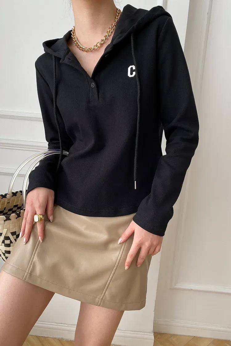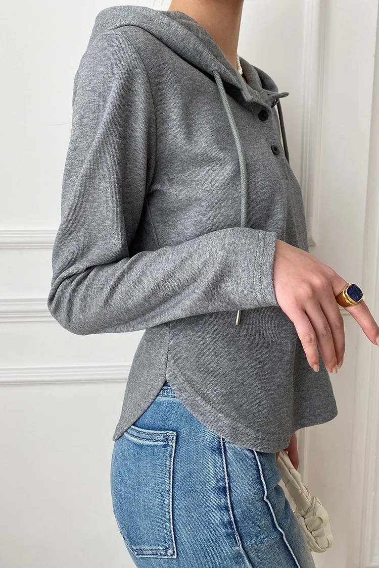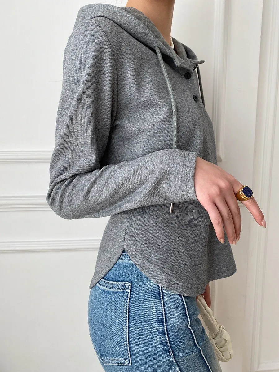 【曲線漫步】隨性感鈕扣小開領高腰線圓弧剪裁連帽上衣