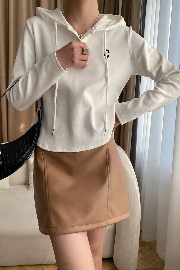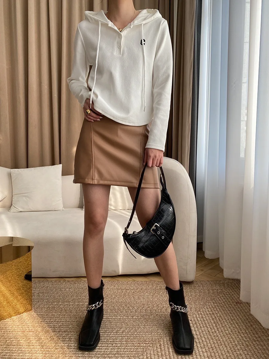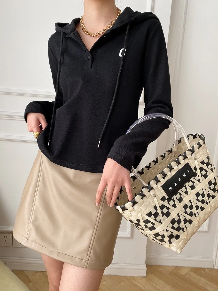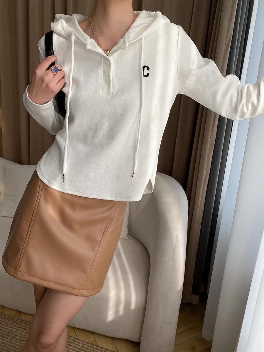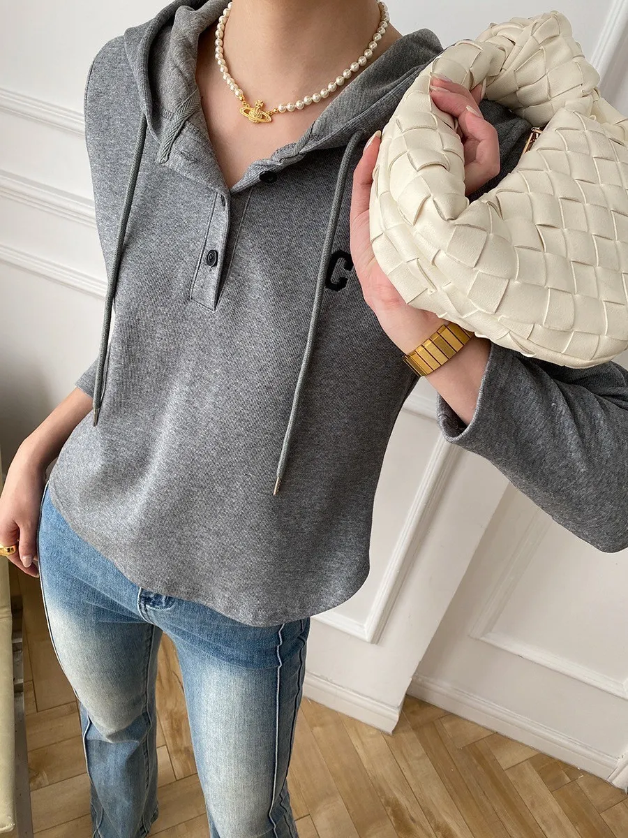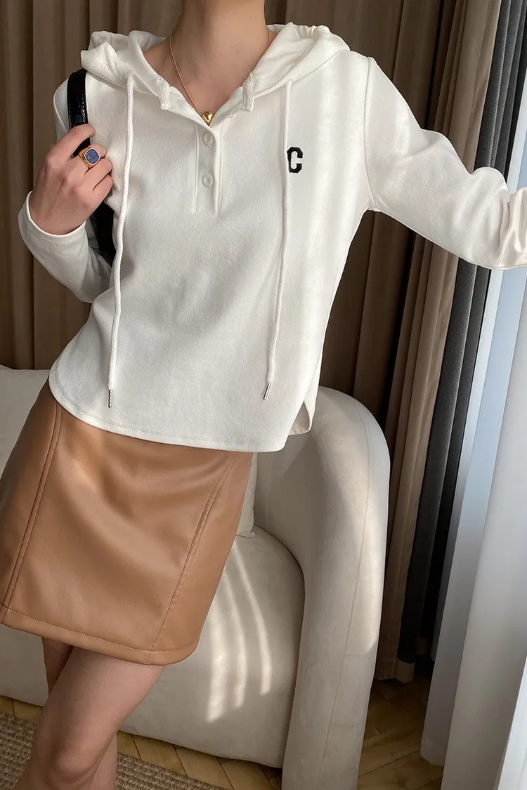 【曲線漫步】隨性感鈕扣小開領高腰線圓弧剪裁連帽上衣