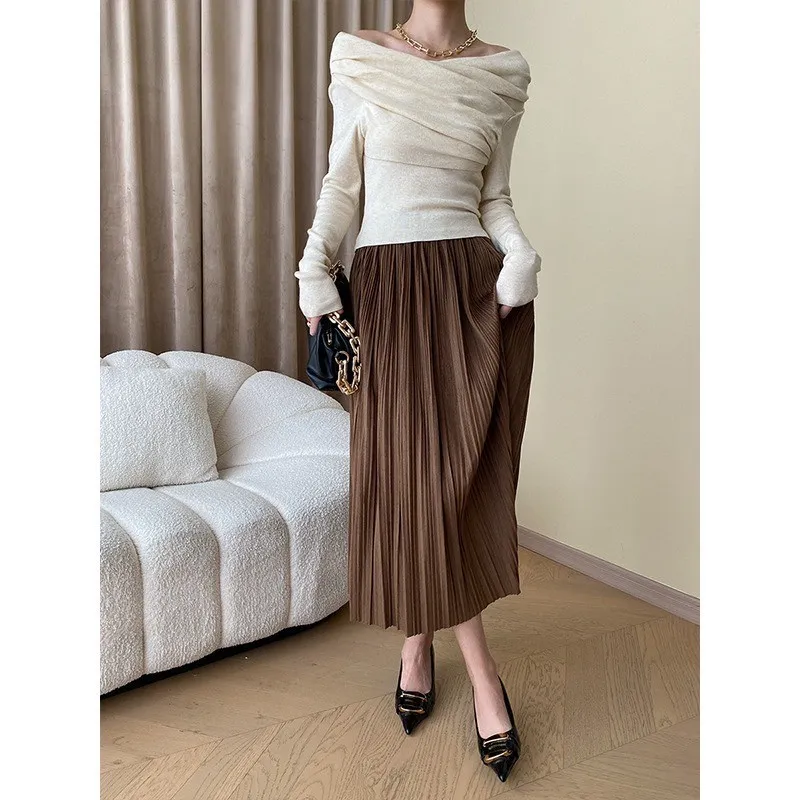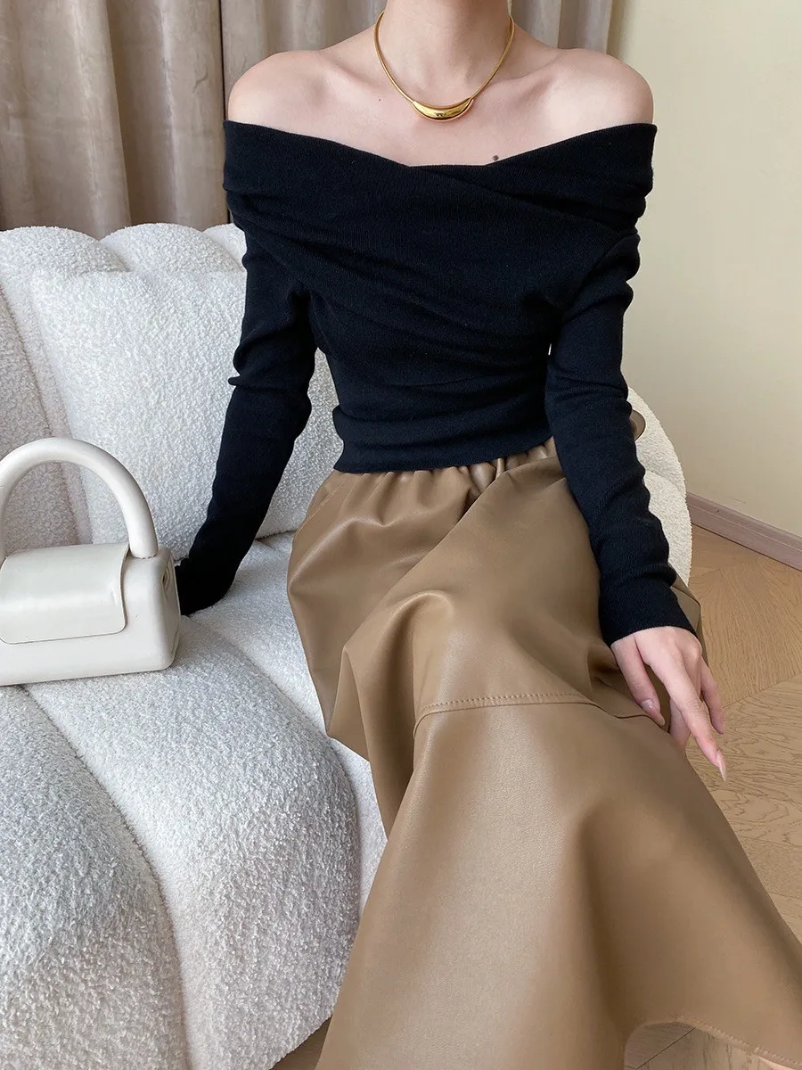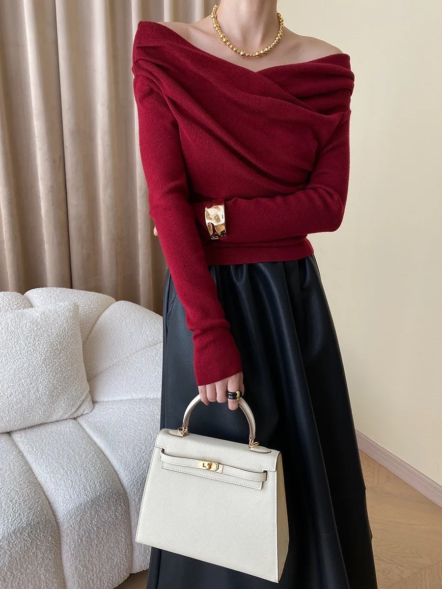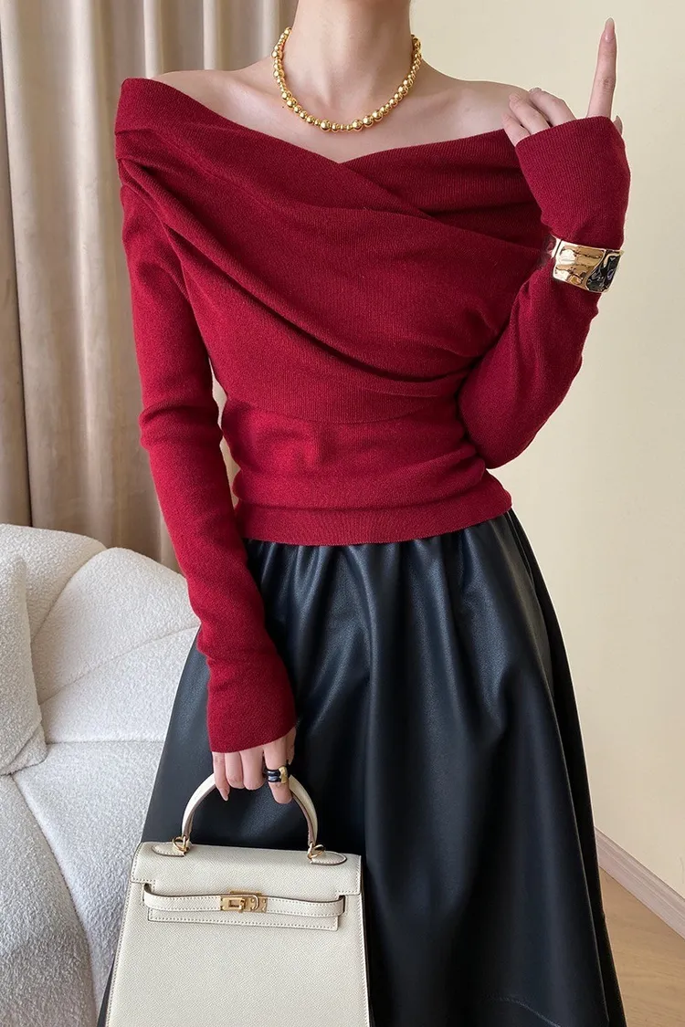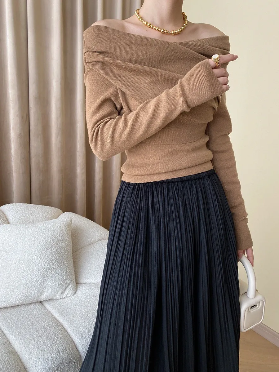 【不規之戀】時髦不規則法式一字肩溫柔風針織上衣