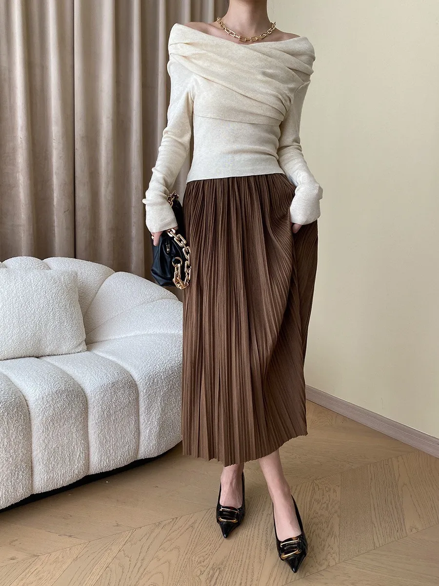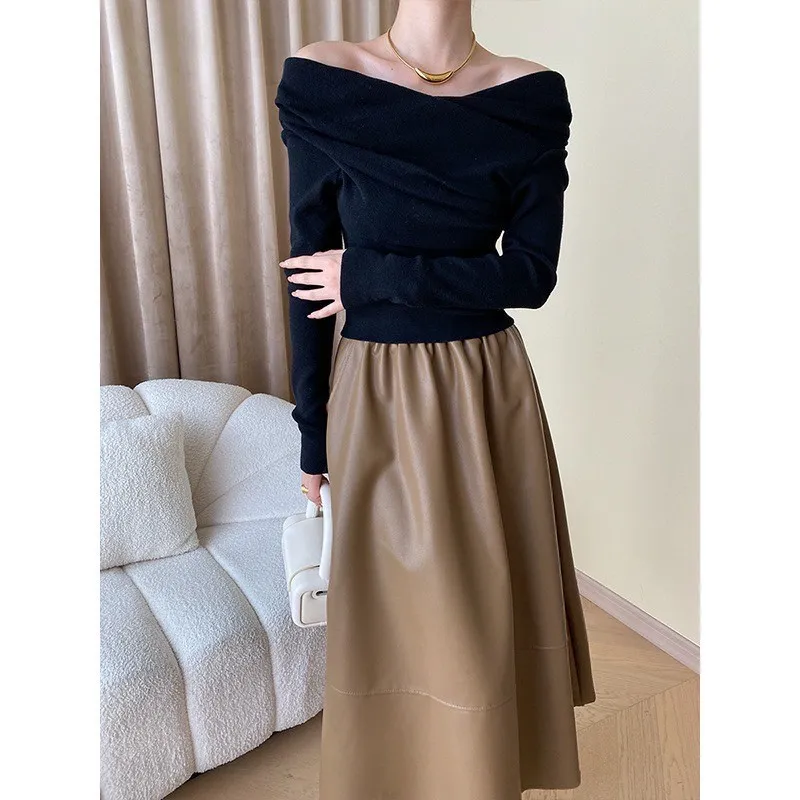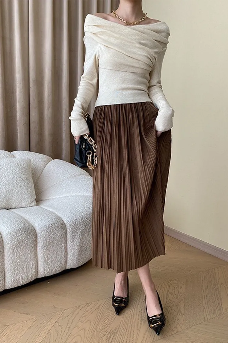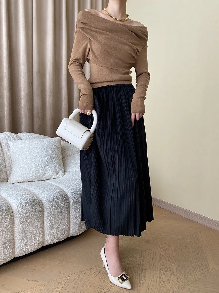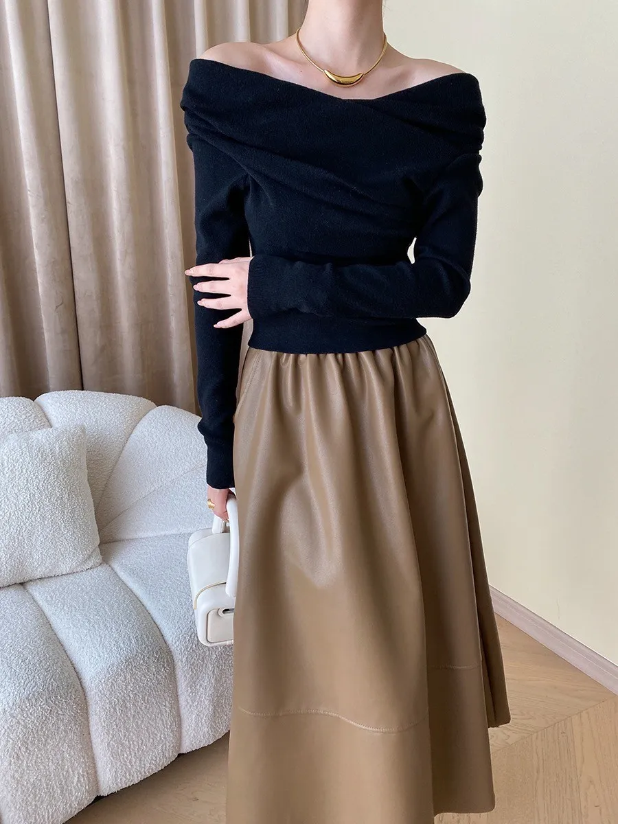 【不規之戀】時髦不規則法式一字肩溫柔風針織上衣