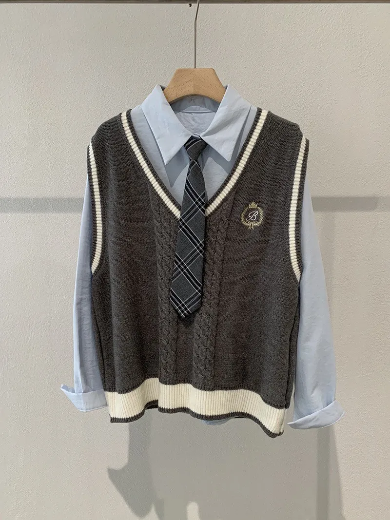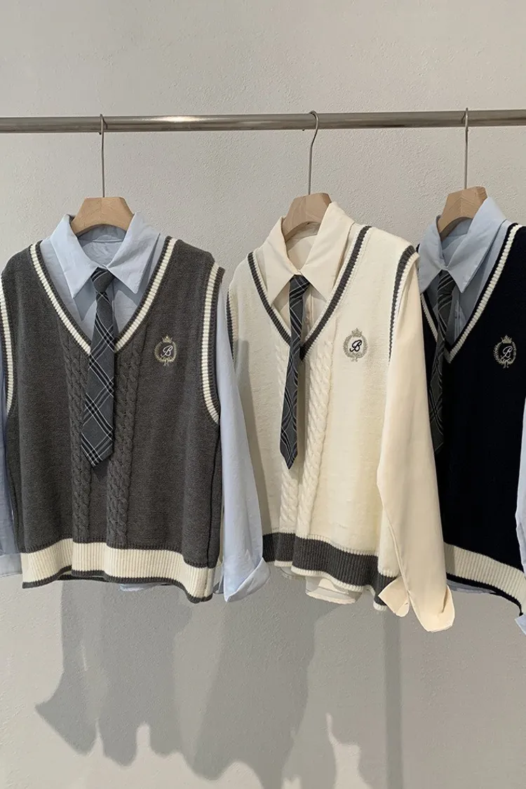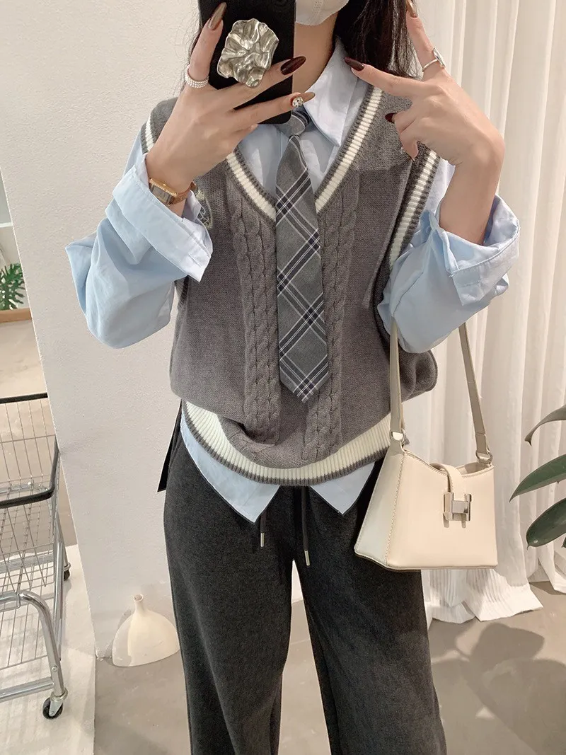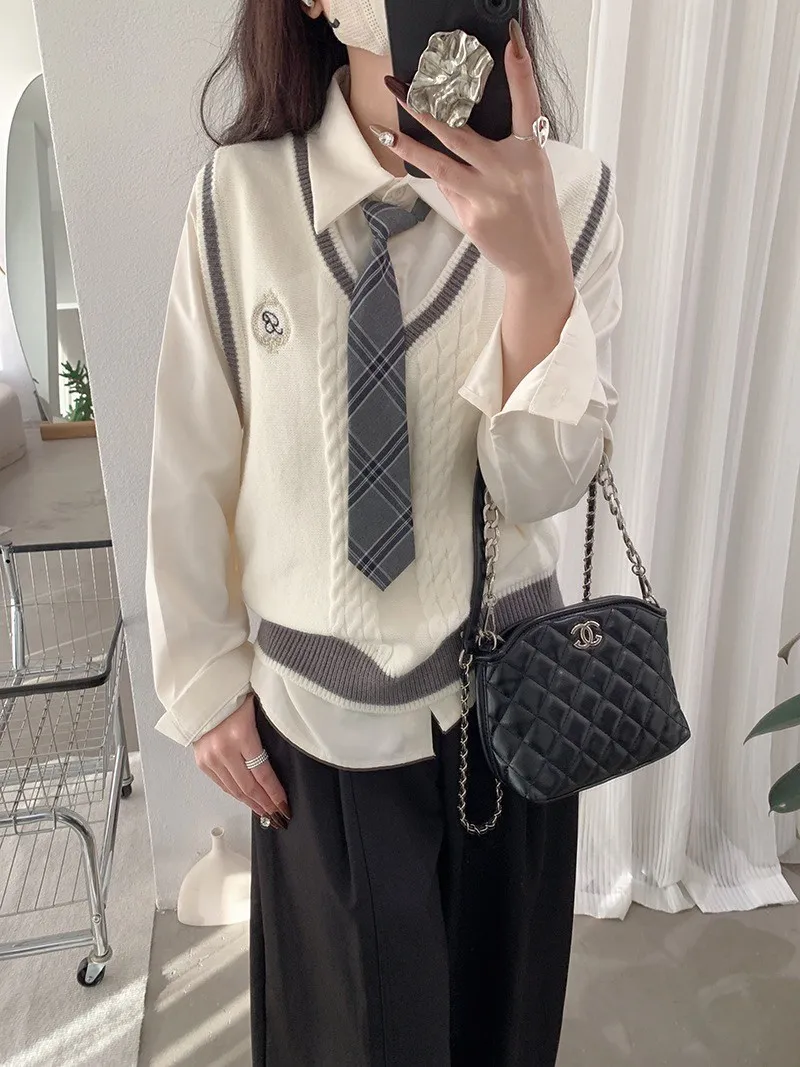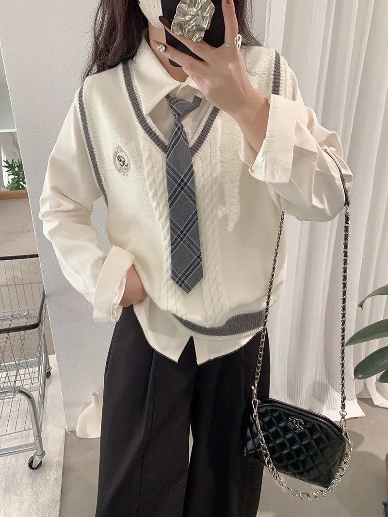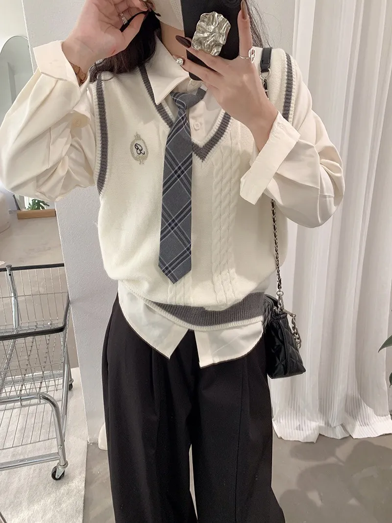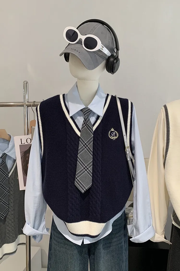 【微叛逆學院】撞色針織馬甲×襯衫×領帶三件套裝
