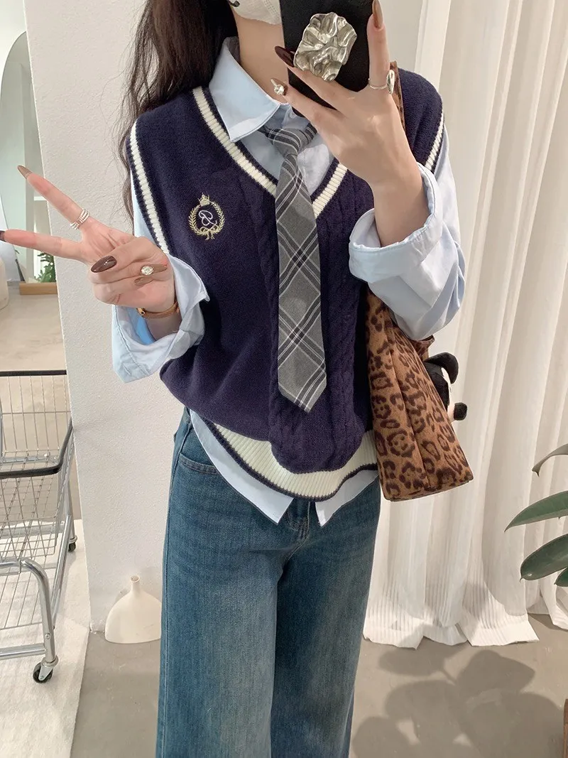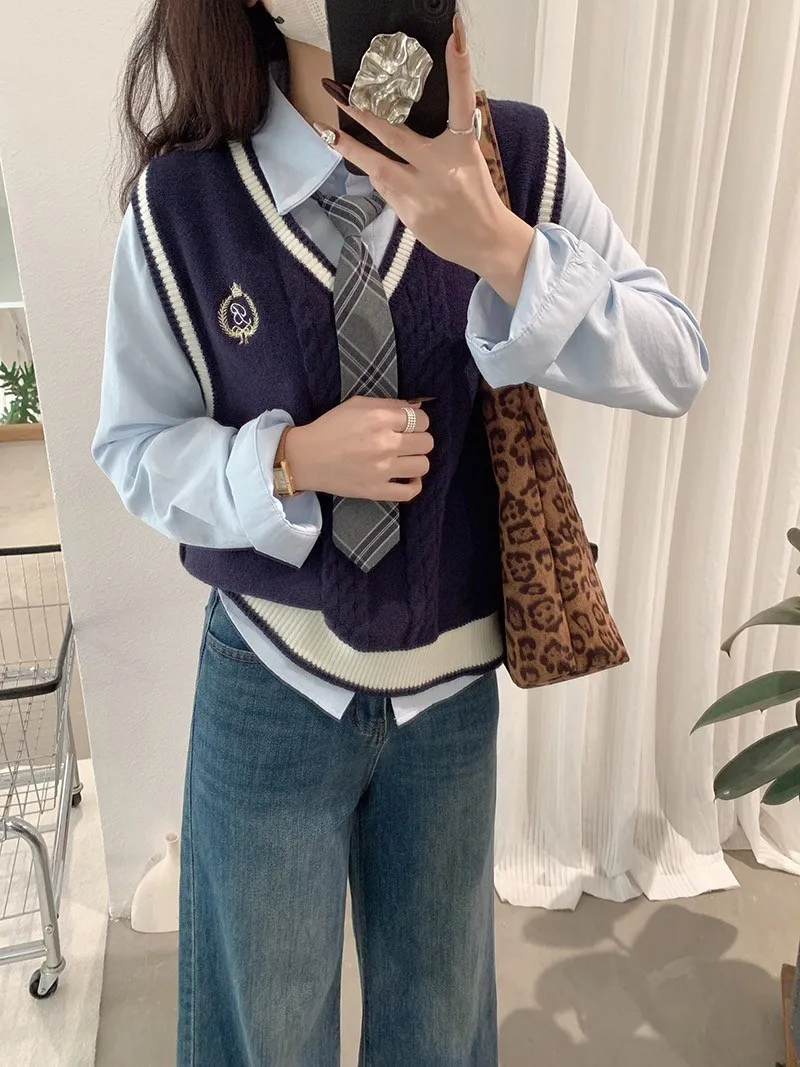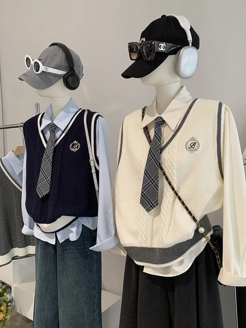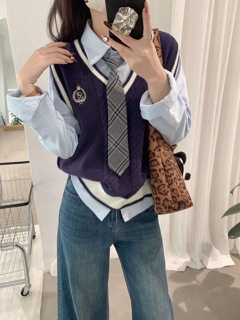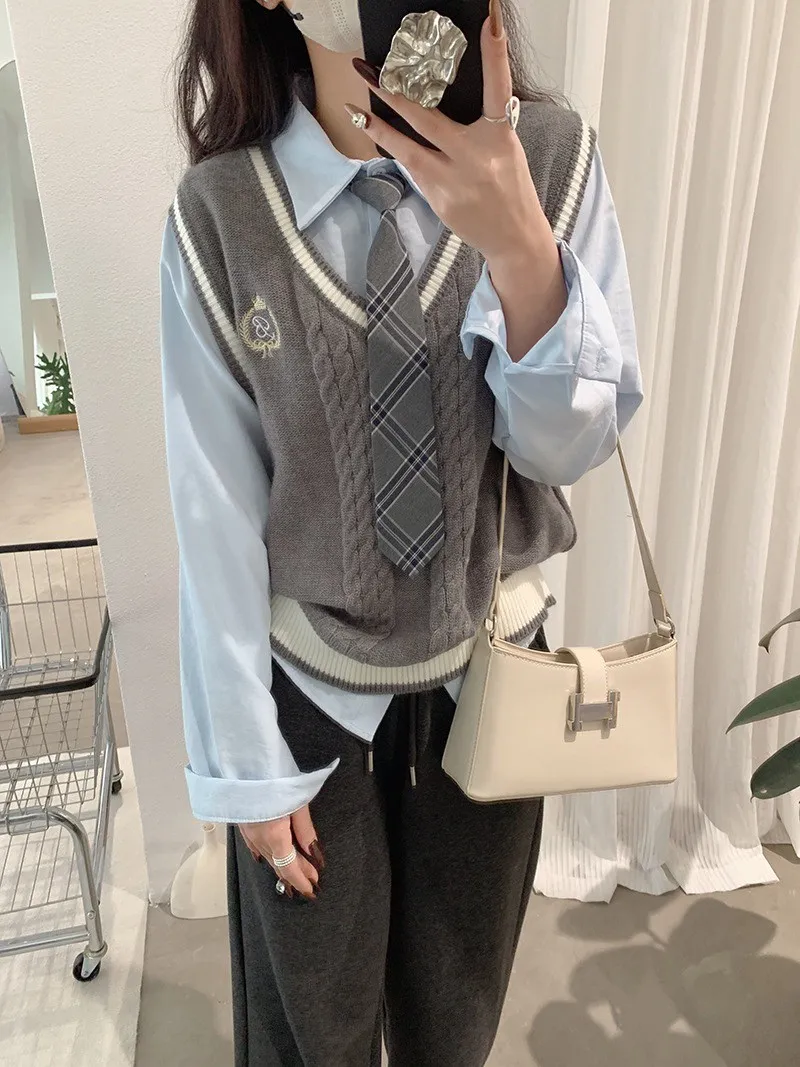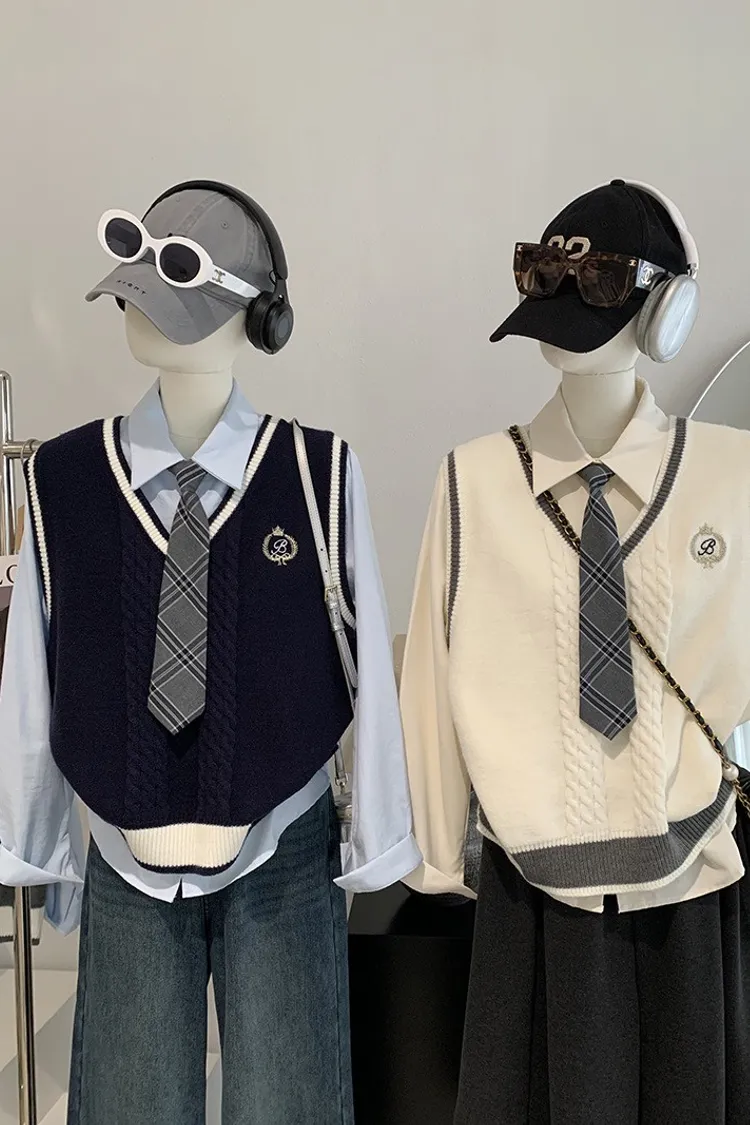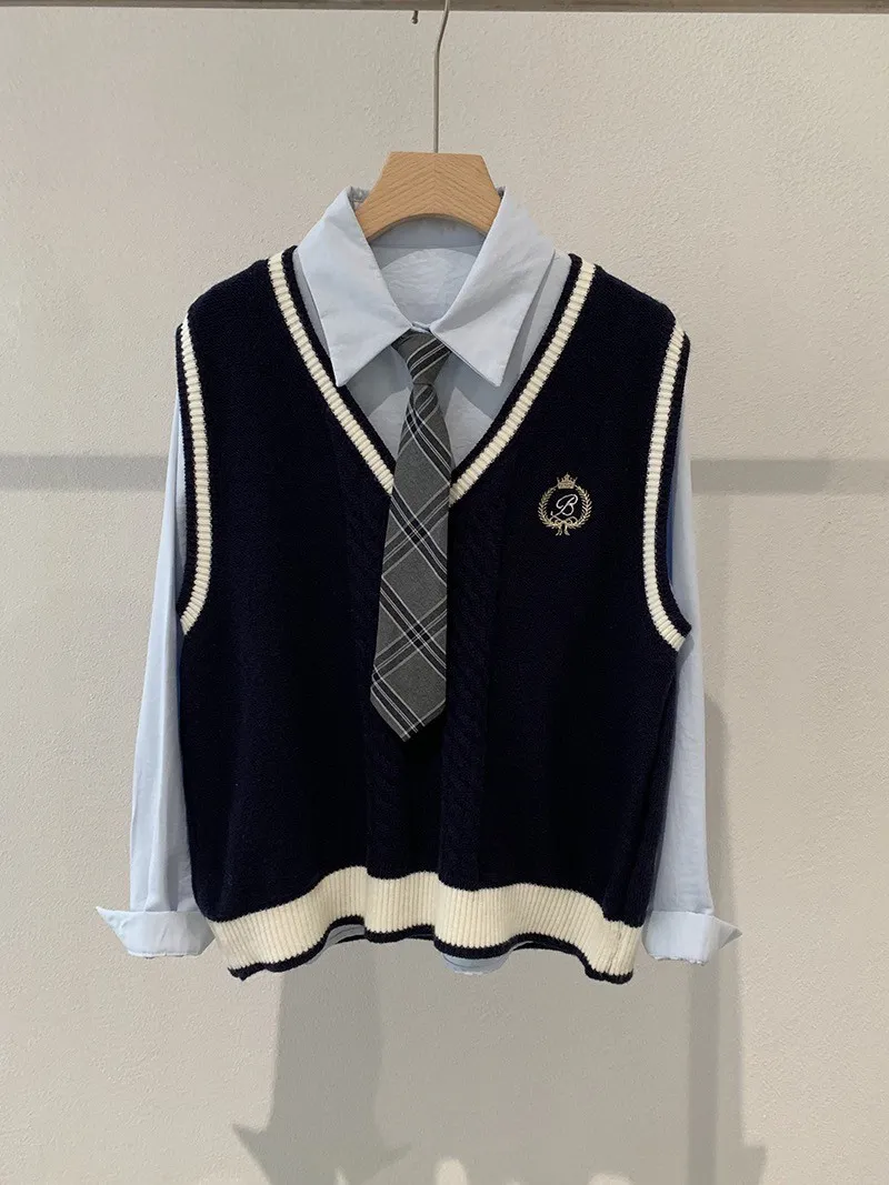 【微叛逆學院】撞色針織馬甲×襯衫×領帶三件套裝