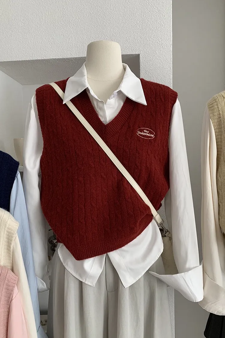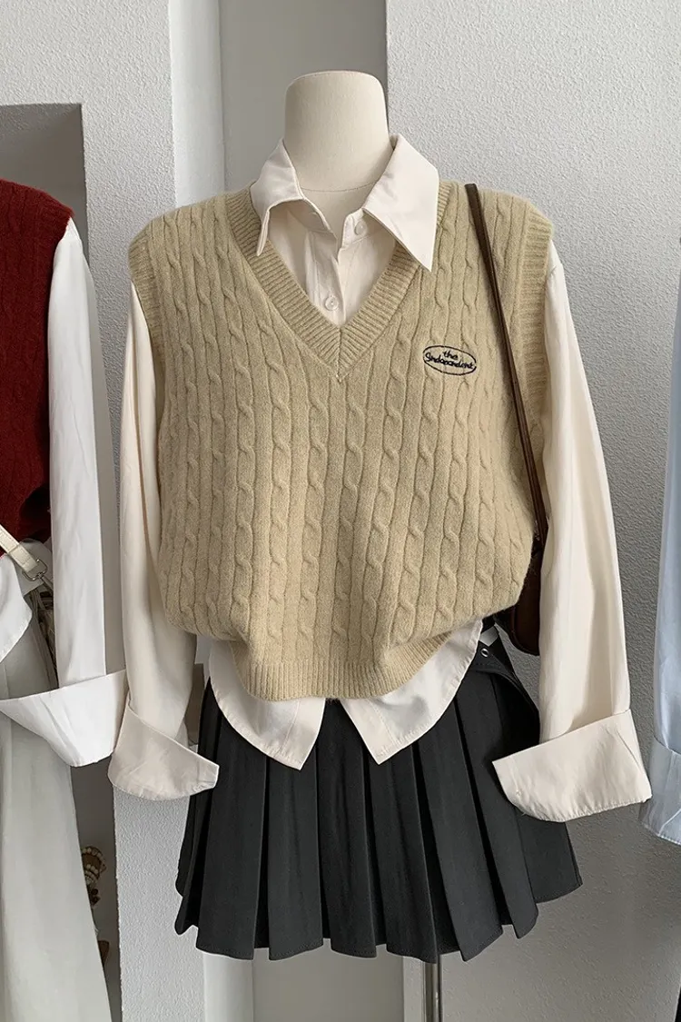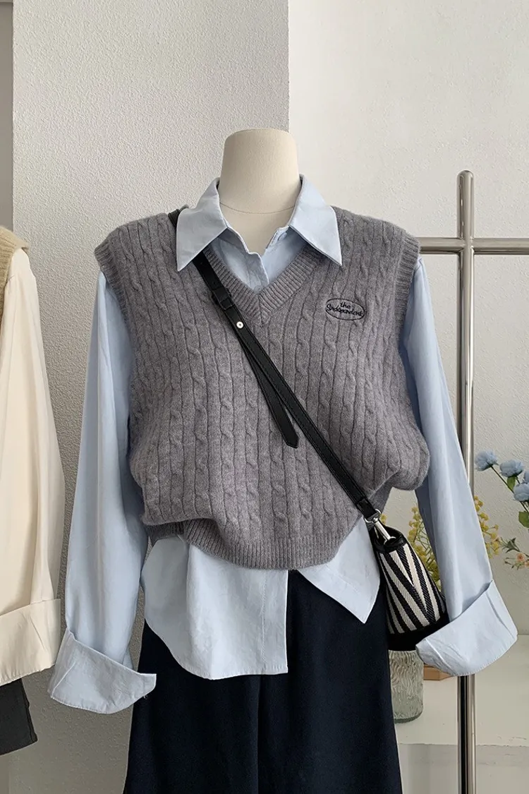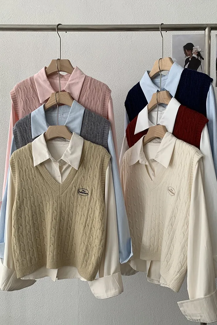 【學院日常】V領刺繡針織馬甲×翻領襯衫套裝