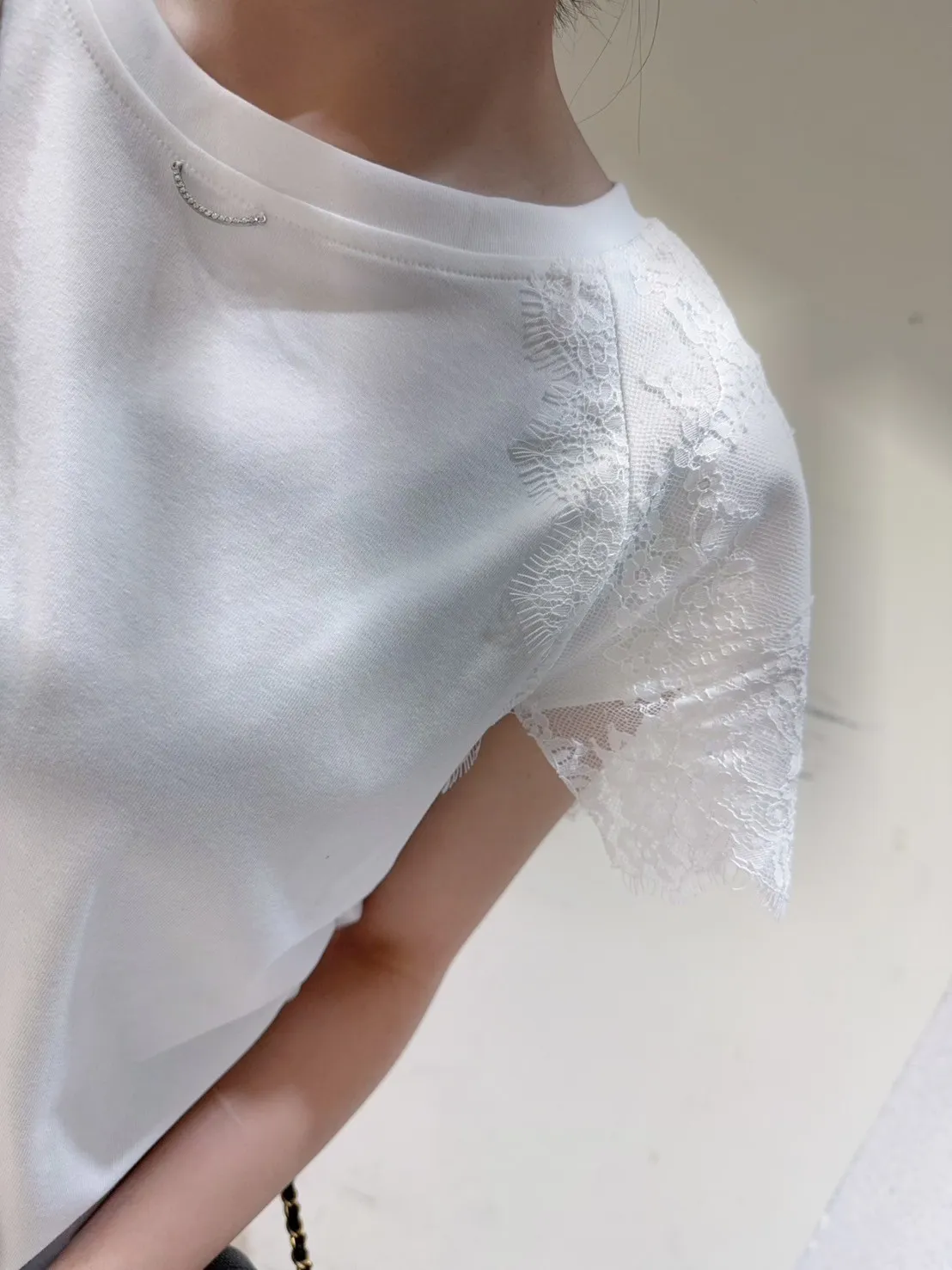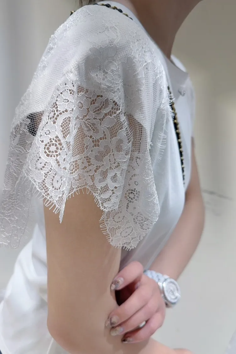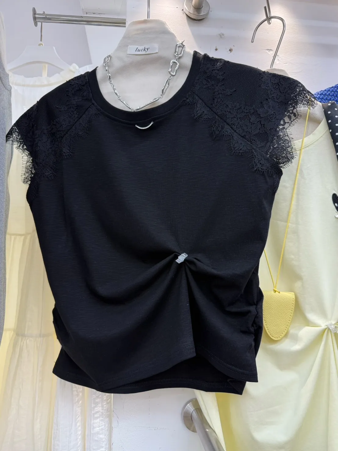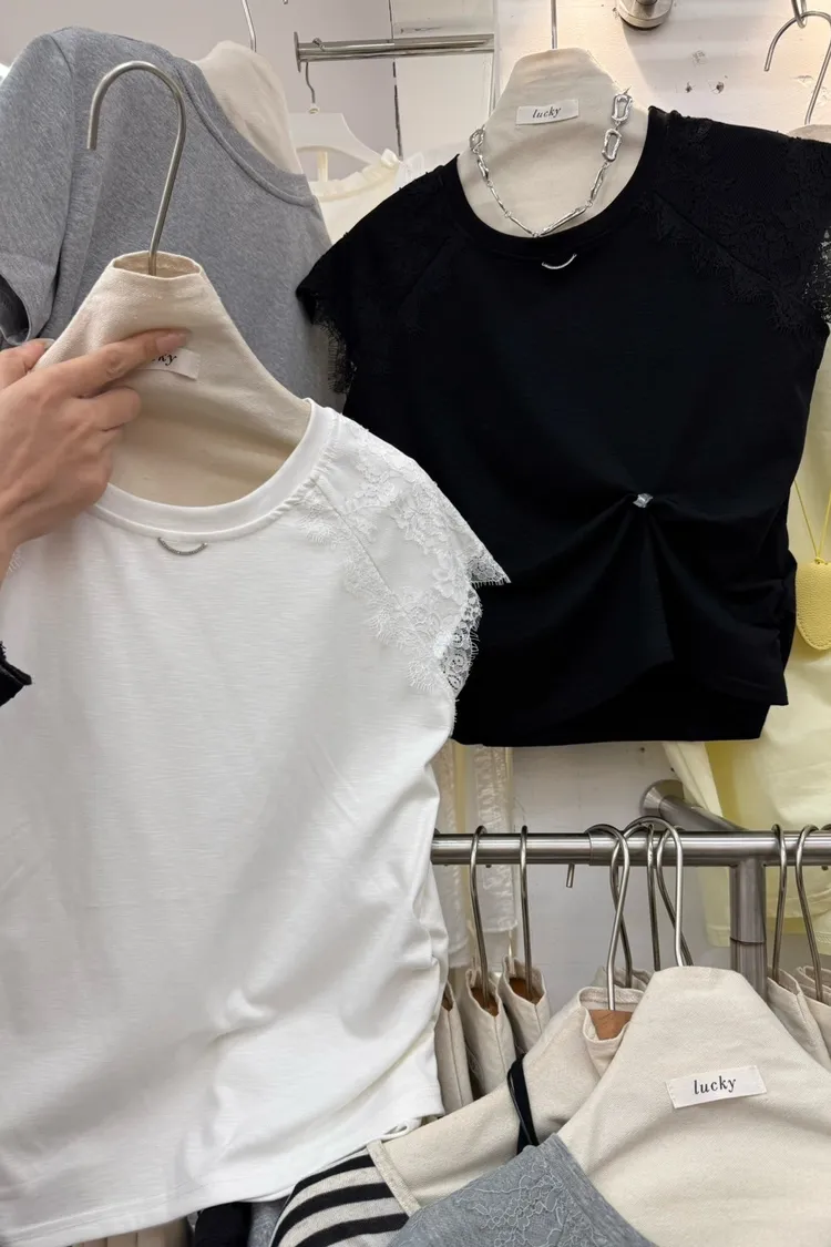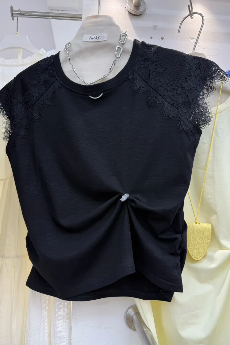 韓國製🇰🇷氣質蕾絲䄂微笑鑽領收腰抓皺棉上衣