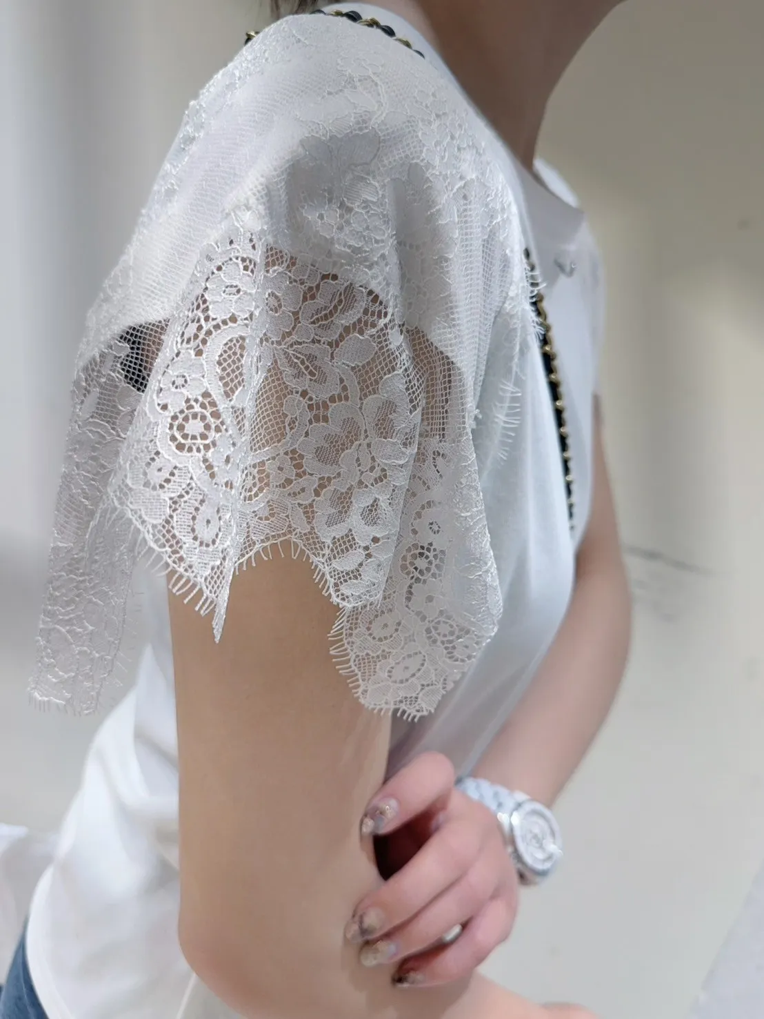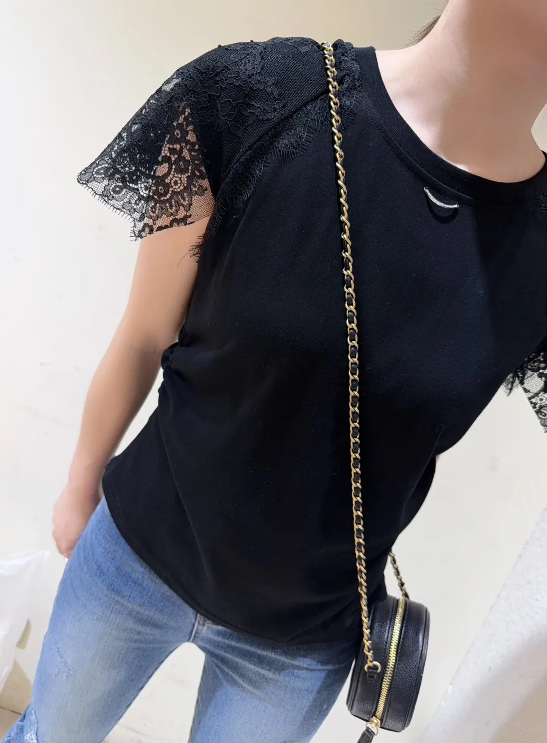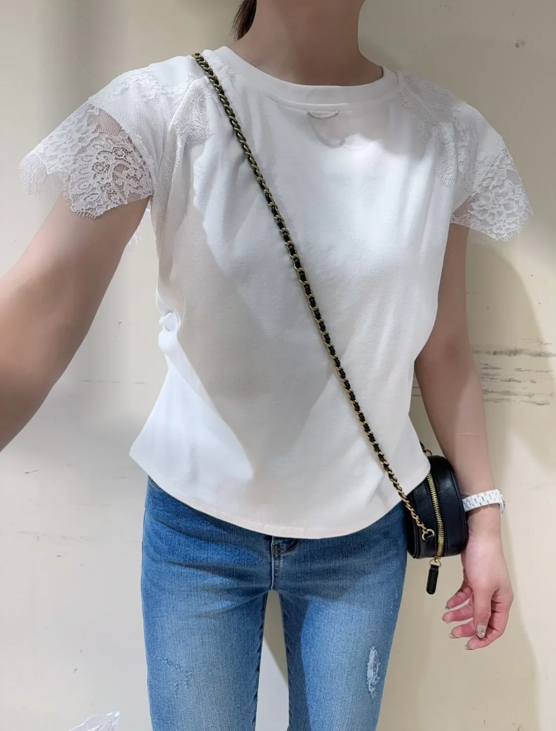 韓國製🇰🇷氣質蕾絲䄂微笑鑽領收腰抓皺棉上衣