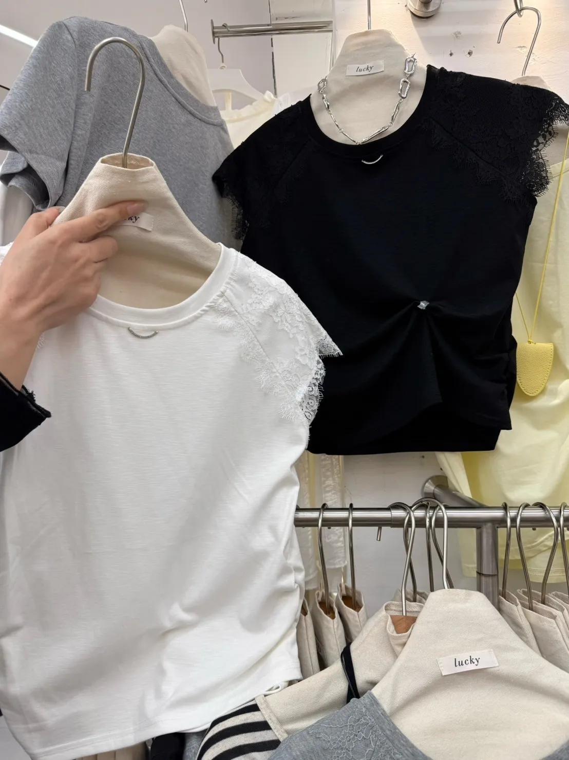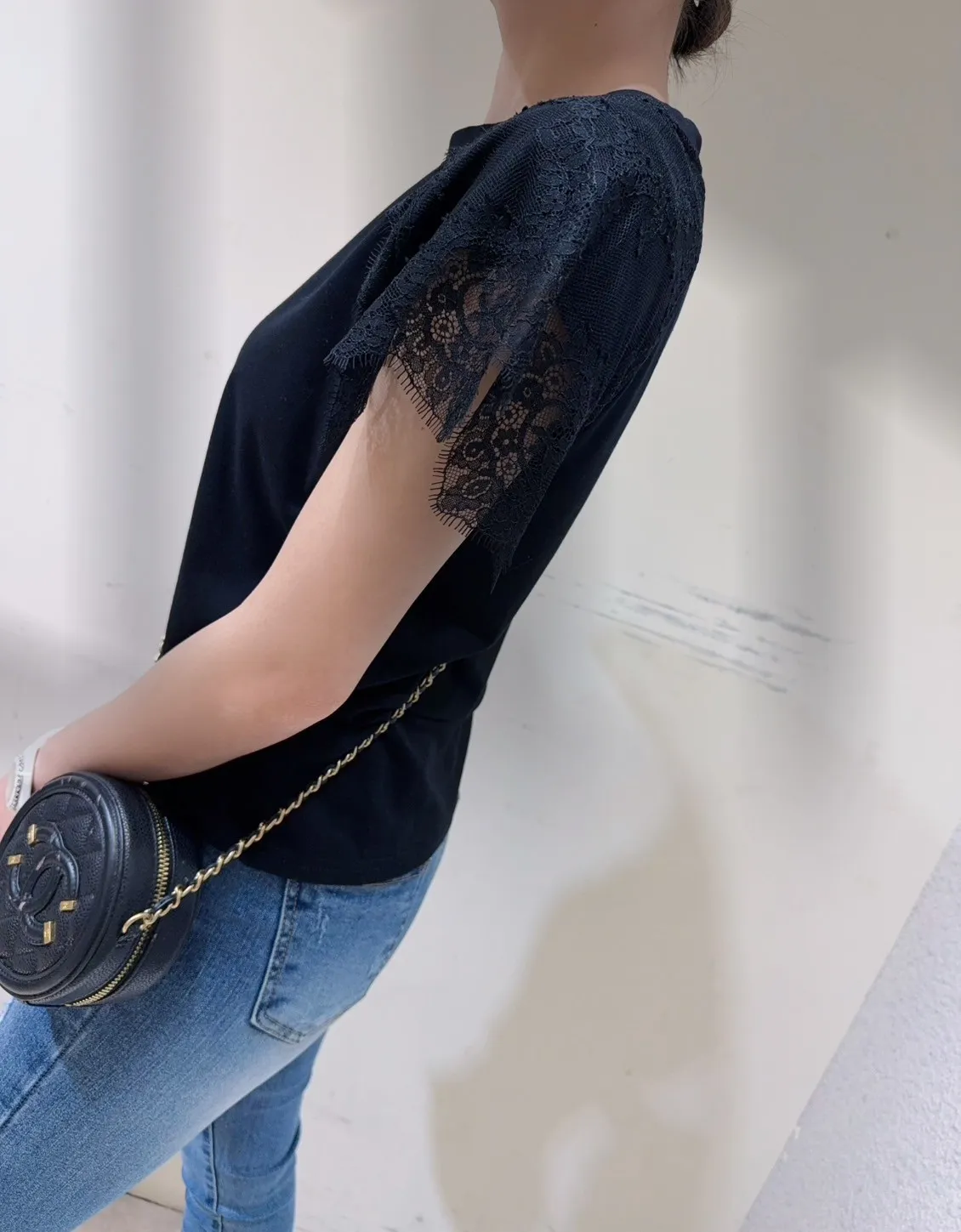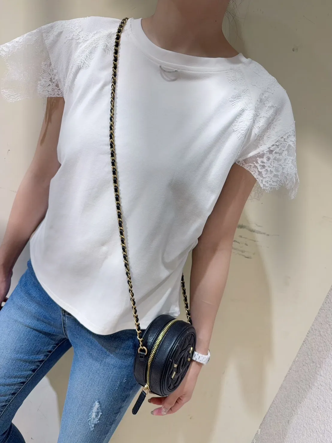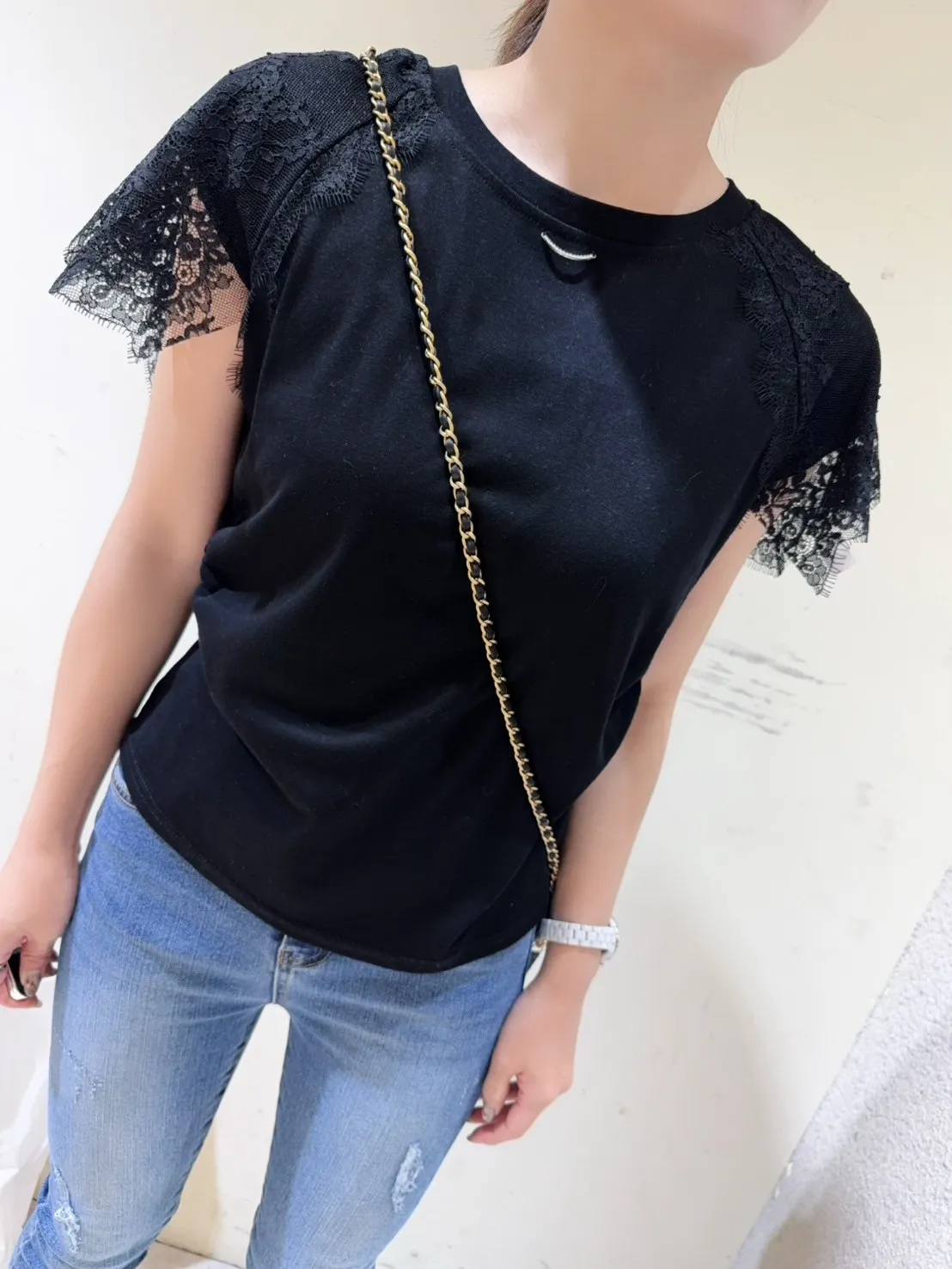 韓國製🇰🇷氣質蕾絲䄂微笑鑽領收腰抓皺棉上衣